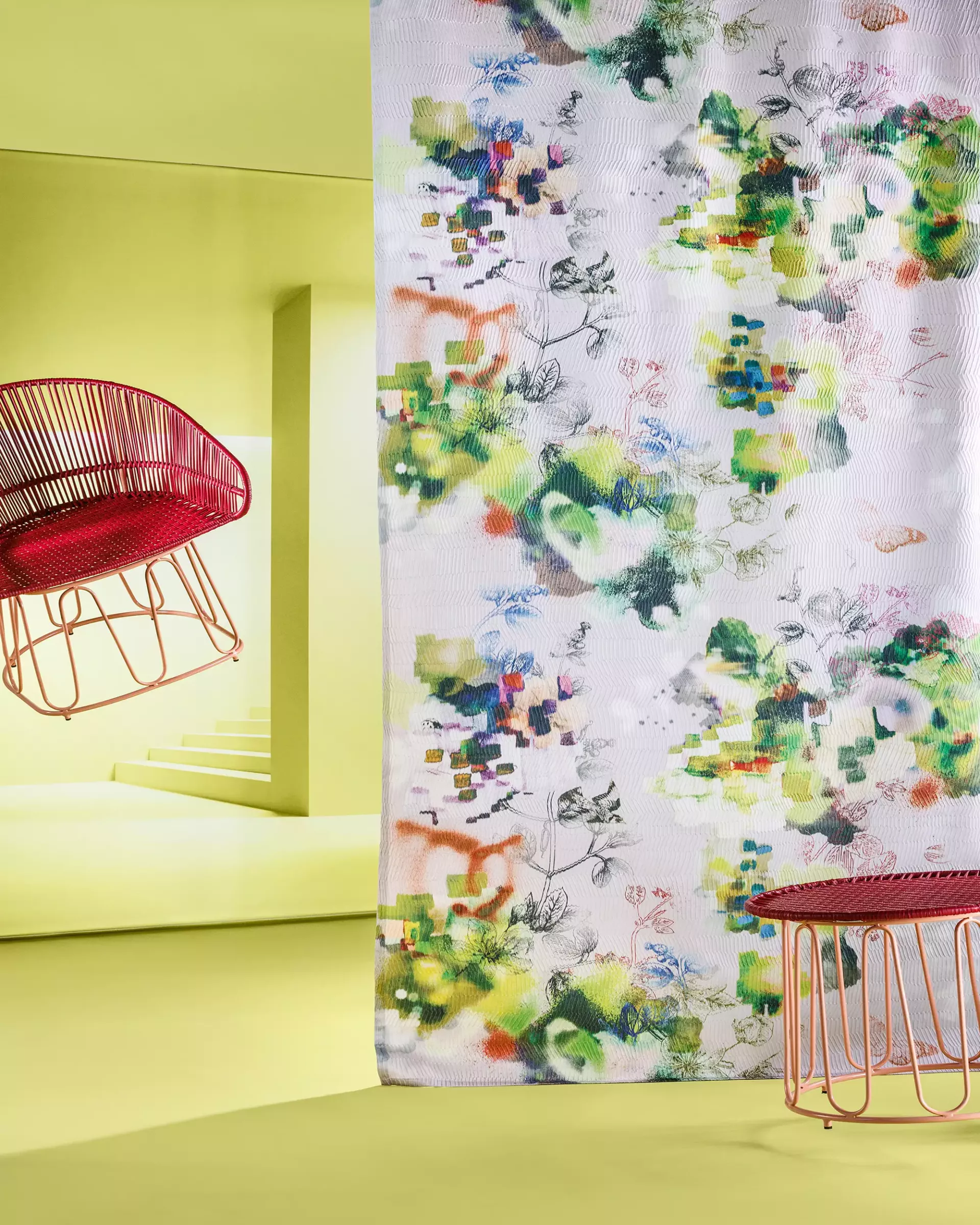 Dichter Vorhangstoff; Die raffinierte Kombination von Kettdruck mit einem Reliefjacquard verwebt sich zu einem farbenprächtigen, fantasievollen Traum. Real-irreal: Überlagerungen, Unschärfe, Dreidimensionalität und abstrakte Formensprache verführen zu Träumereien. Ein Lieblingsstück für kreative textile Statements im Raum.