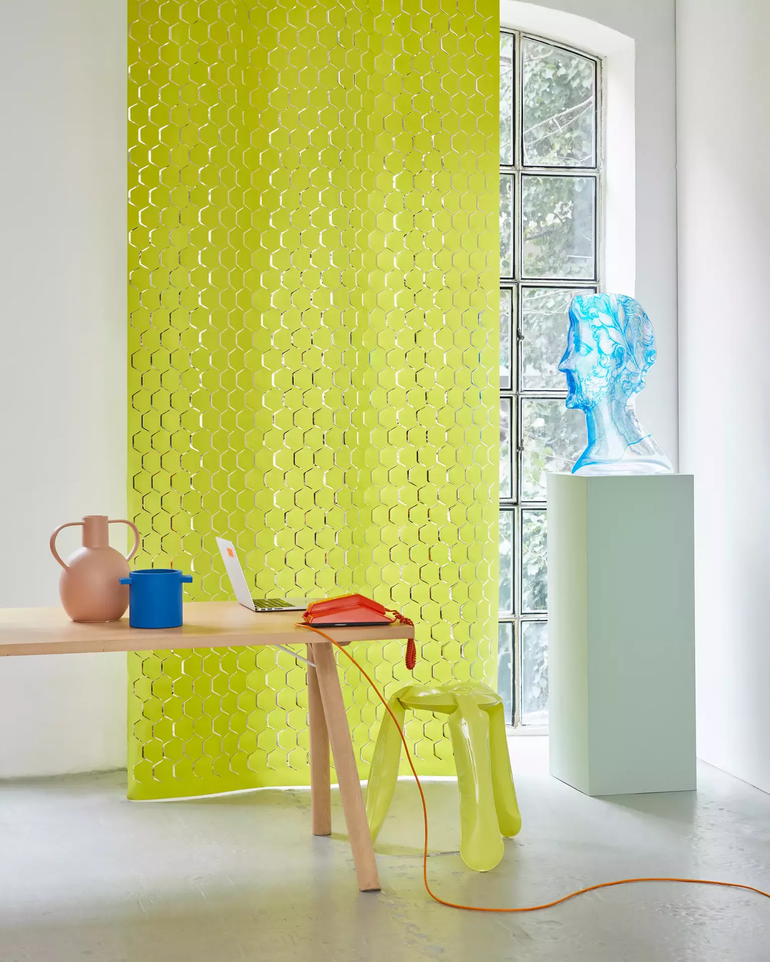 Dichter Dekorationsstoff; Hochwertiger Laser in extravaganter, zeitgemässer Opulenz. Die partiell ausgelaserten Sechsecke ergeben in Bewegung und Kombination mit der Spiegelfolie ein raffiniertes und elektrisierendes Spiel. Electra sorgt für einen skulpturalen und eindrucksvollen Auftritt im Raum.