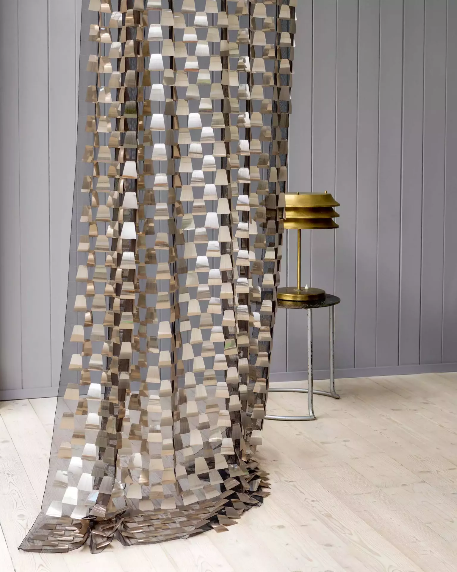 Transparenter Vorhangstoff; Dieser extravagante Artikel gibt sich kapriziös und versprüht einen Hauch von Glamour. Schillernde Vierecke aus Paillettenmaterial sind auf den hochtransparenten Tüll appl