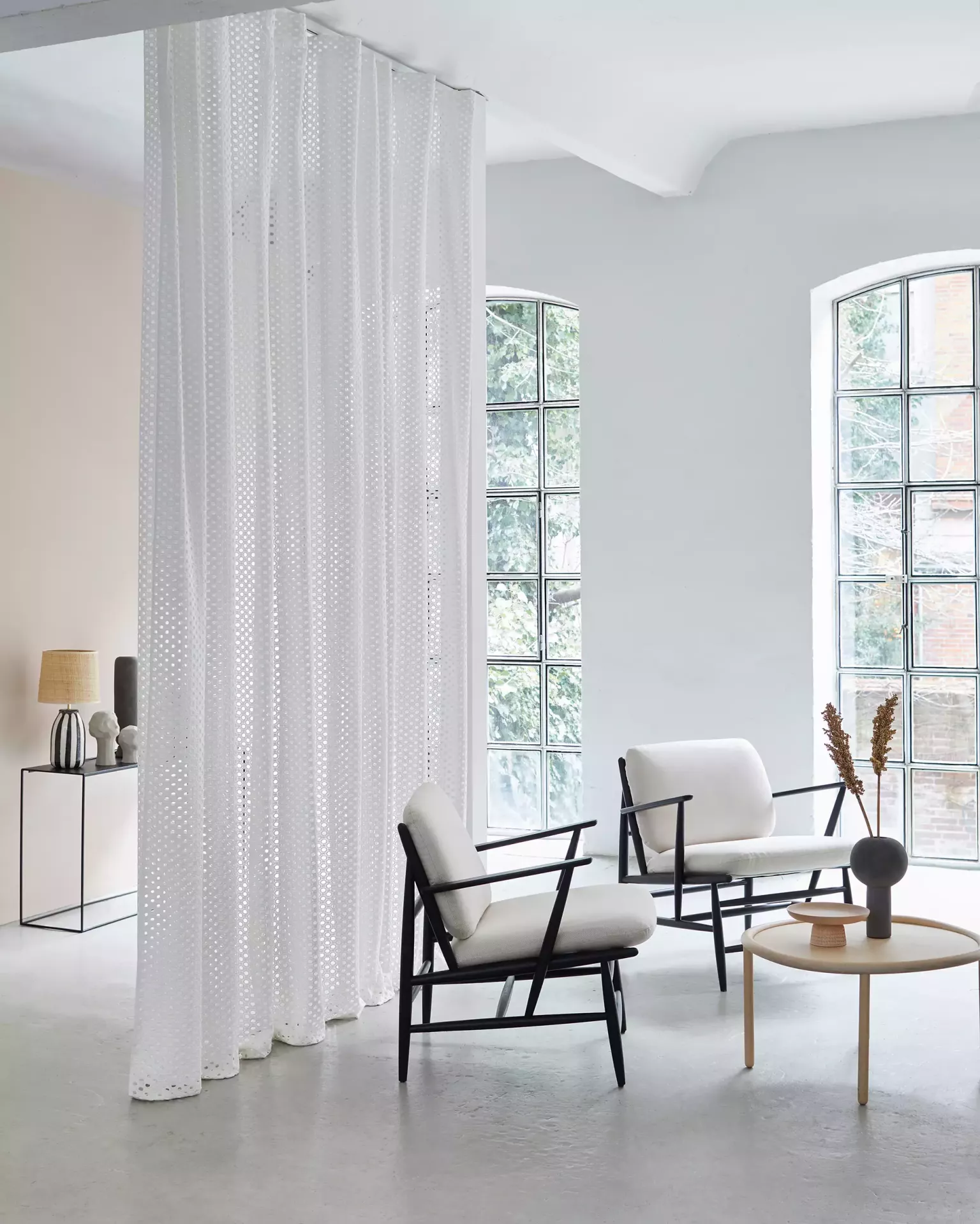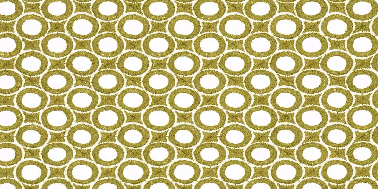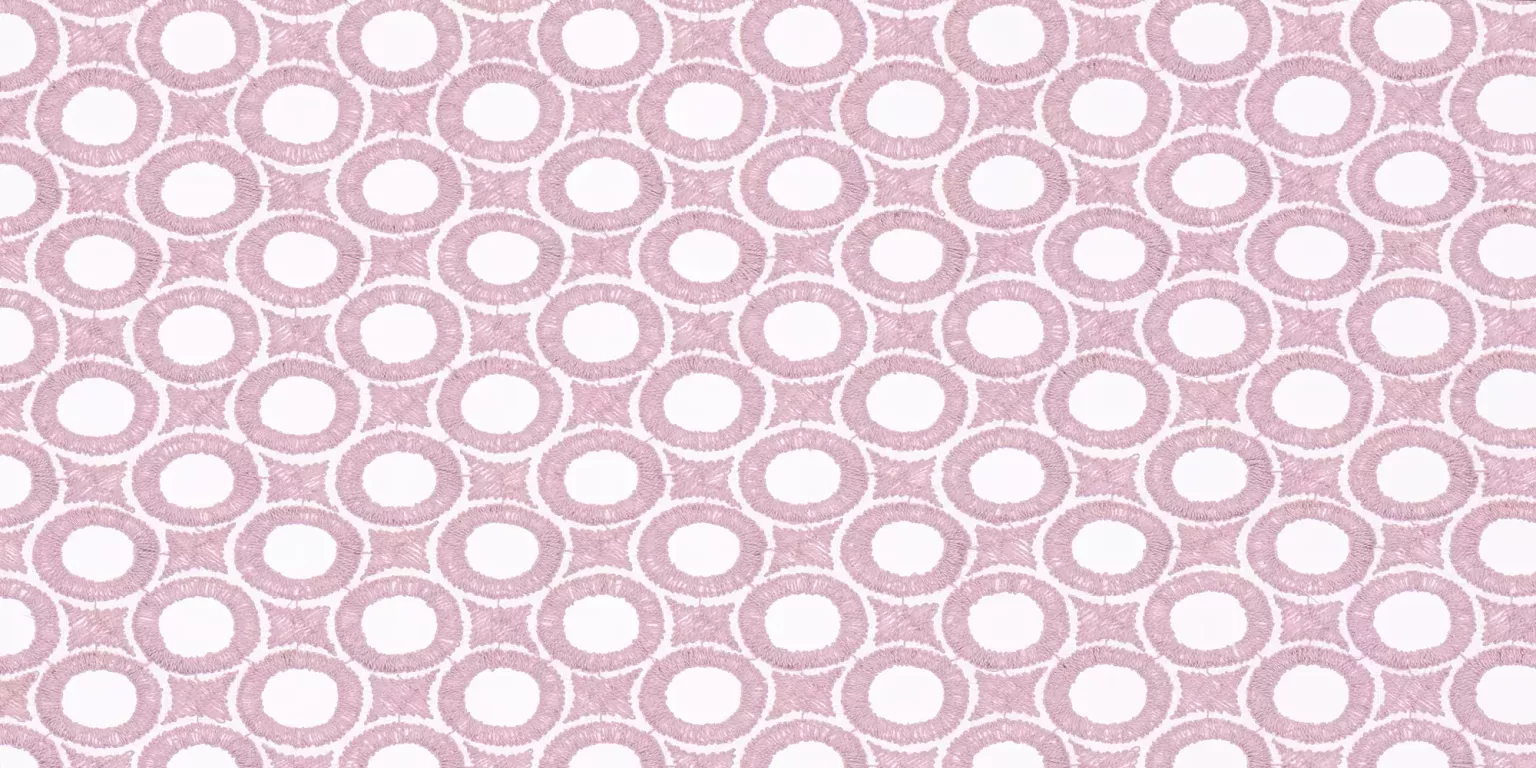 Transparenter Dekorationsstoff in Polyester flammhemmend. Hochwertige, voluminöse Lochstickerei auf transparenter Grundware. Kreise bilden einen technisch anmutenden Raster, welcher mit traditioneller Stickerei umgesetzt wird. Klarheit und Strenge treffen gekonnt auf Emotionalität – eine textile Interpretation des Zeitgeistes.