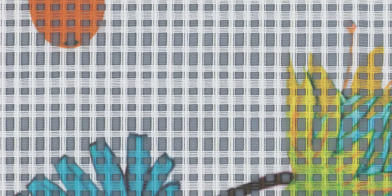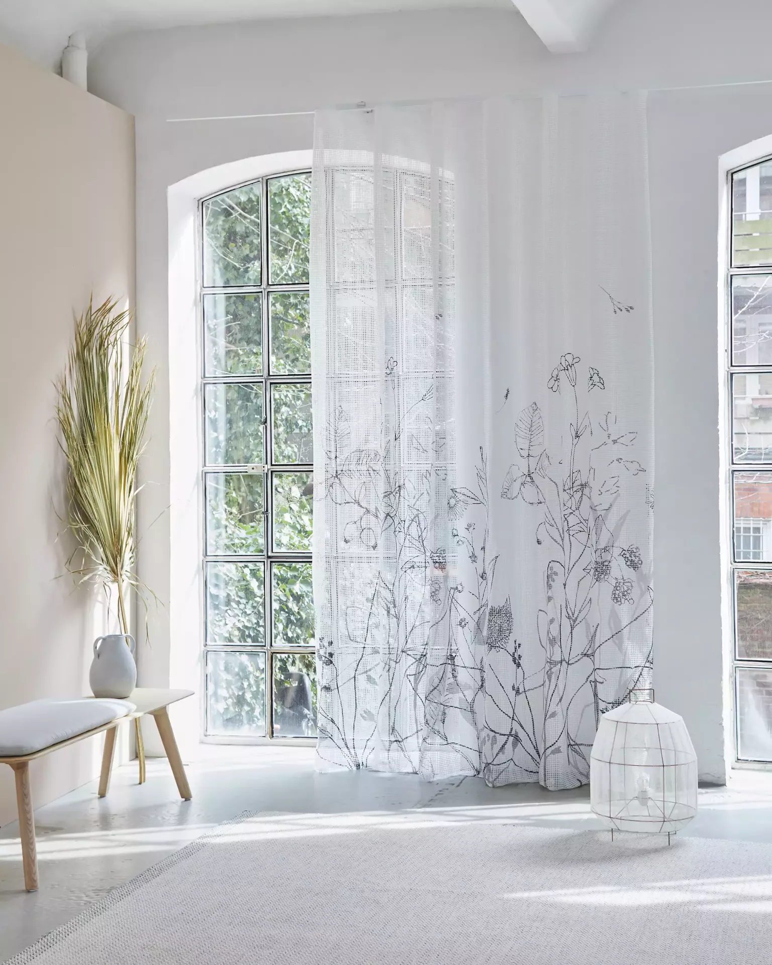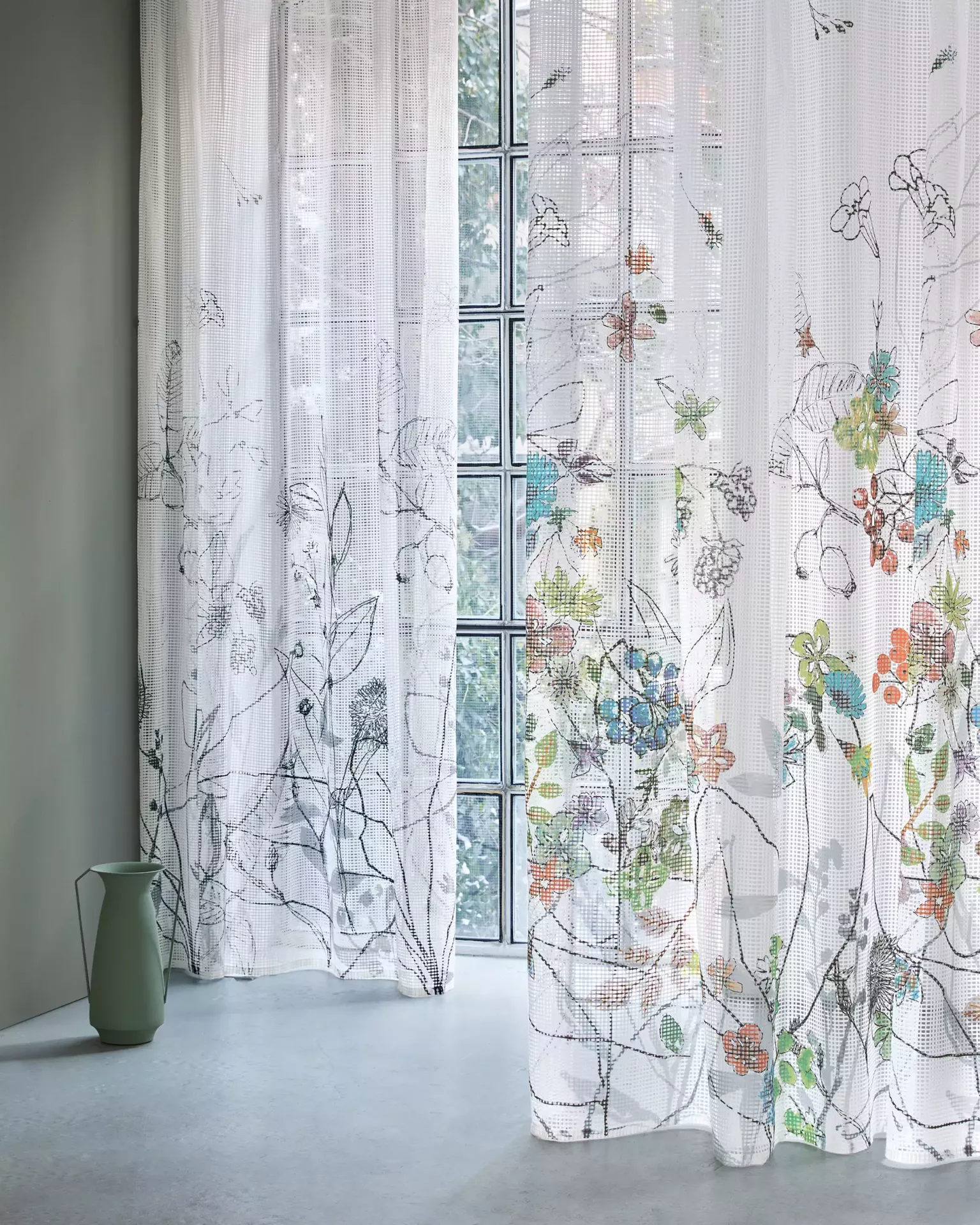 Transparenter Vorhangstoff; Wie spontan skizziert, überlagern sich Blüten und Blätter und erinnern an einen wild angelegten Garten. Bunte Blüten sorgen für fröhliche Akzente. Der zeichnerische Charakter dieses Digitaldrucks bildet einen spannenden Gegenpol zur akkuraten Gitterstruktur der Grundware.