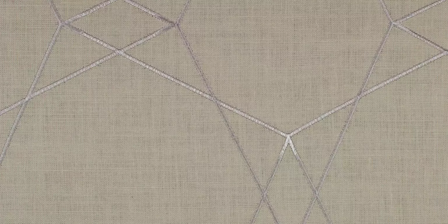 Eleganter Dekorationsstoff; Die hochwertige Stickerei mit Metallgarn legt sich netzartig über die blickdichte Leinenqualität und bildet eine ornamentale Gitterstruktur. Das zeitgemässe Thema Metall wird spannend mit natürlichem Leinen in erdigen Farbtönen kombiniert.
