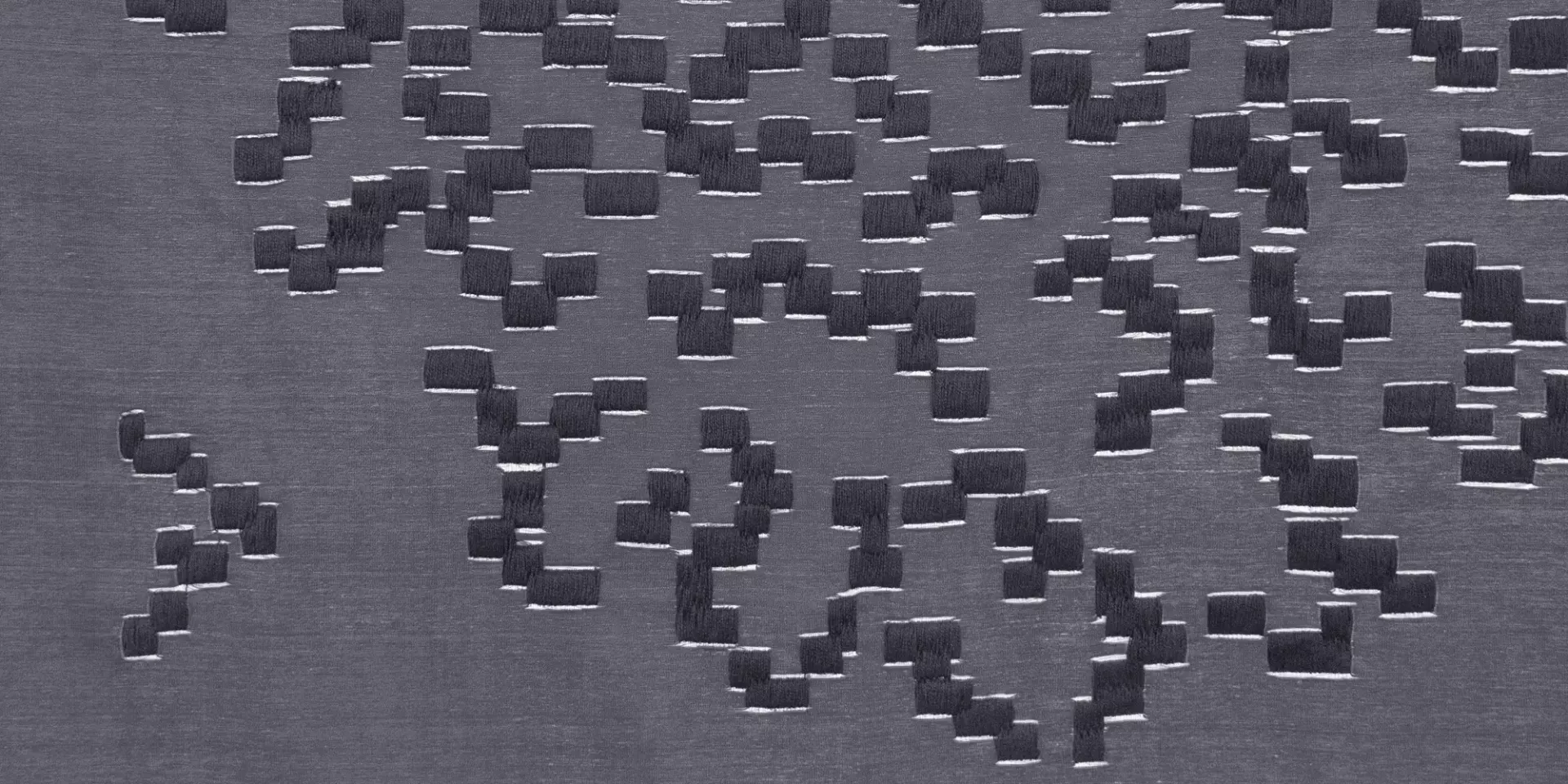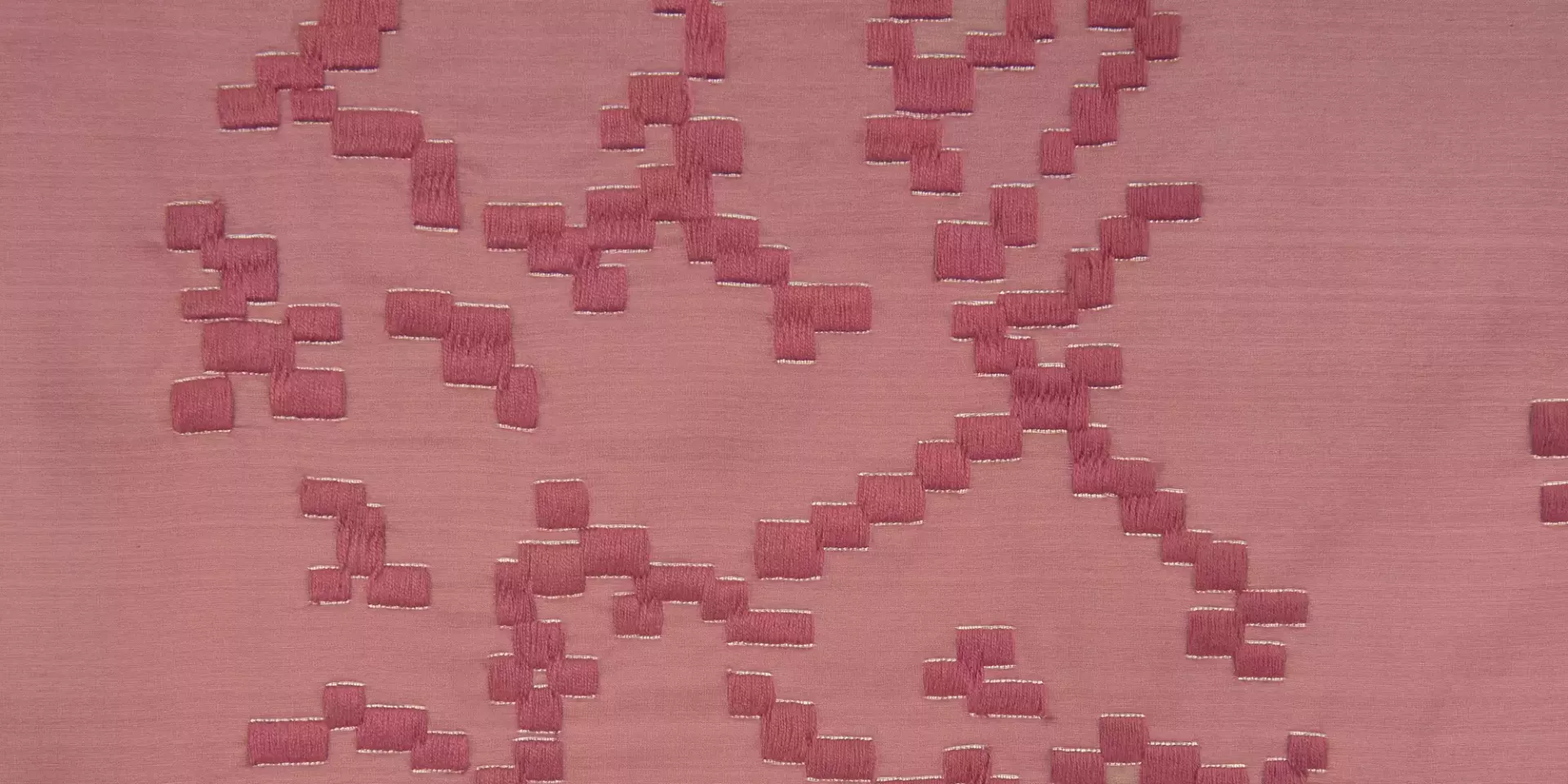 Dense curtain fabric; elegant, three-dimensional embroidery on silk taffeta. Fascinating contrast between the opulent embroidery with matt yarn and the iridescent sheen of the silk. Classically inspired palmette motif and floral arrangements are implemented in pixel form.