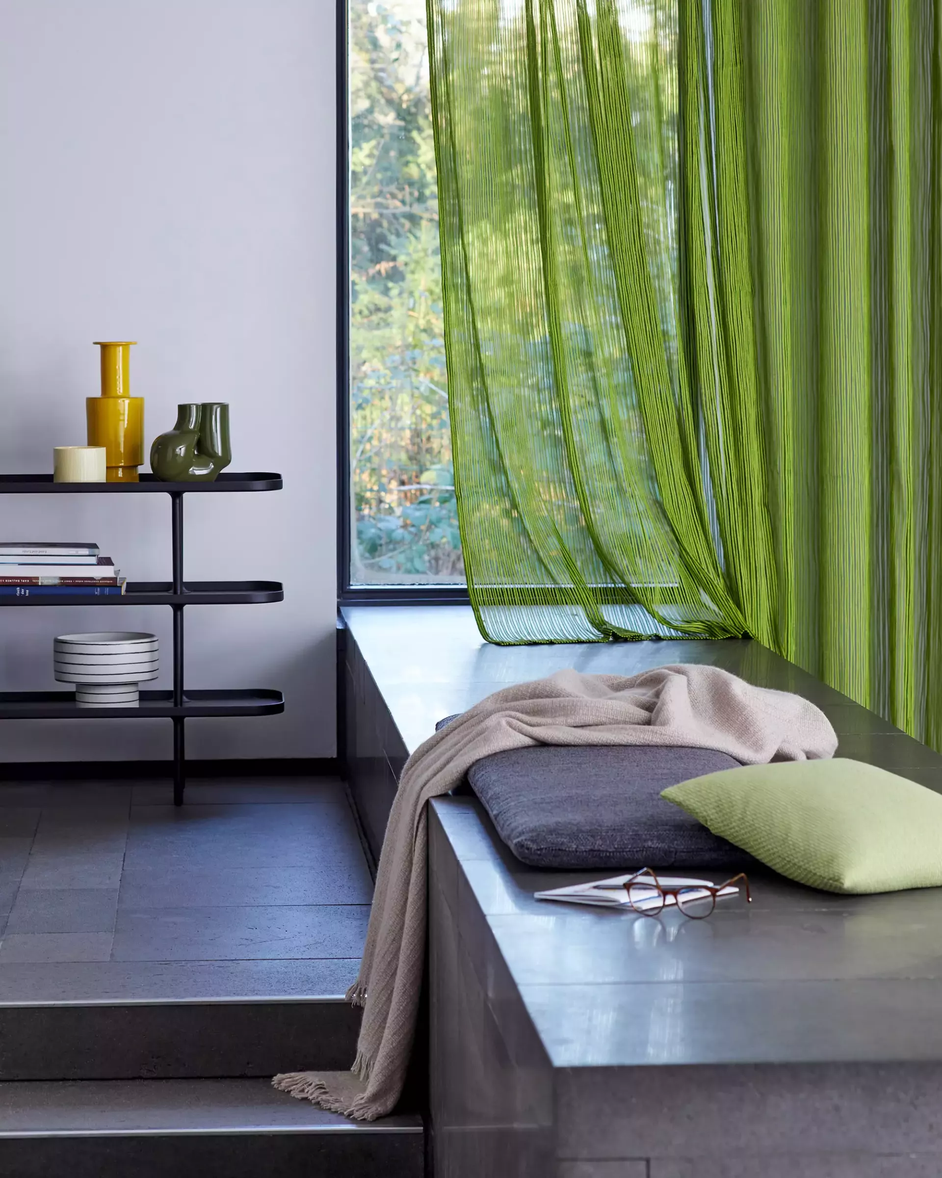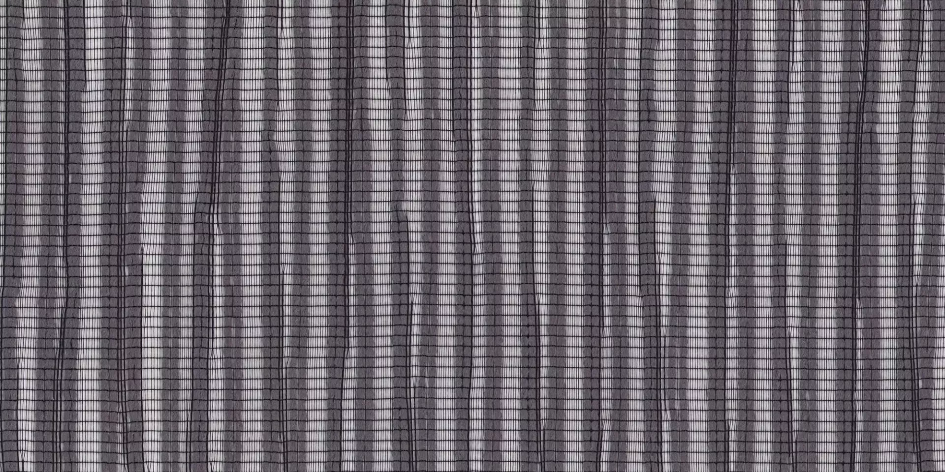 Transparenter Vorhangstoff in Trevira CS; Ein markantes Schussgarn erzeugt dekorative Längsstreifen. Die Linien verteilen sich wie schwebend auf dem transparenten Fond des Drehergewebes. Das unregelmässig eingebundene Schussgarn unterstreicht den entspannten Ausdruck dieses charaktervollen Unis.