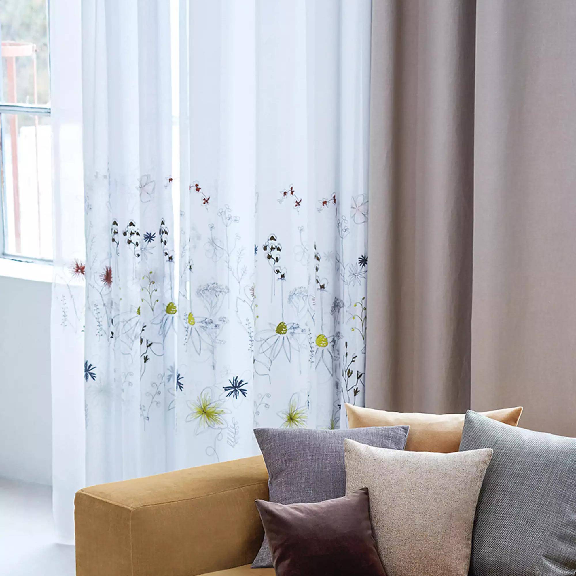 Transparent curtain fabric; filigree embroidered floral border on Serata with a subtle, poetic expression. The fascinating interplay between different embroidery thread qualities and color accents emphasizes the value and gives Serata Fior that certain something.
