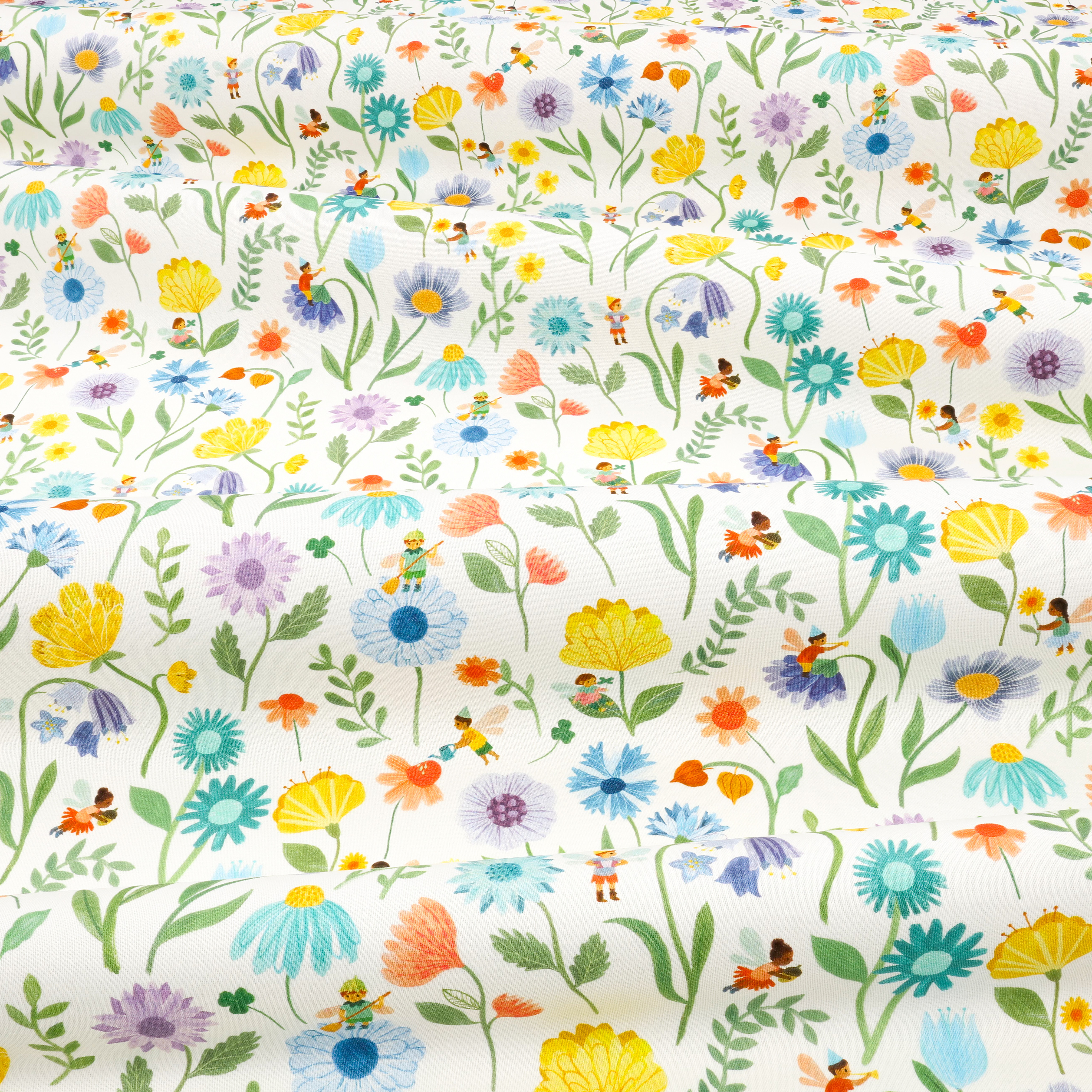 Treten Sie ein in eine magische Welt, in der Feen zwischen Blumen herumflattern und sich liebevoll um ihre Gärten kümmern. Das auf weicher Baumwolle gedruckte Fairy Garden-Design verzaubert das Kinderzimmer und kreiert unvergessliche Augenblicke.