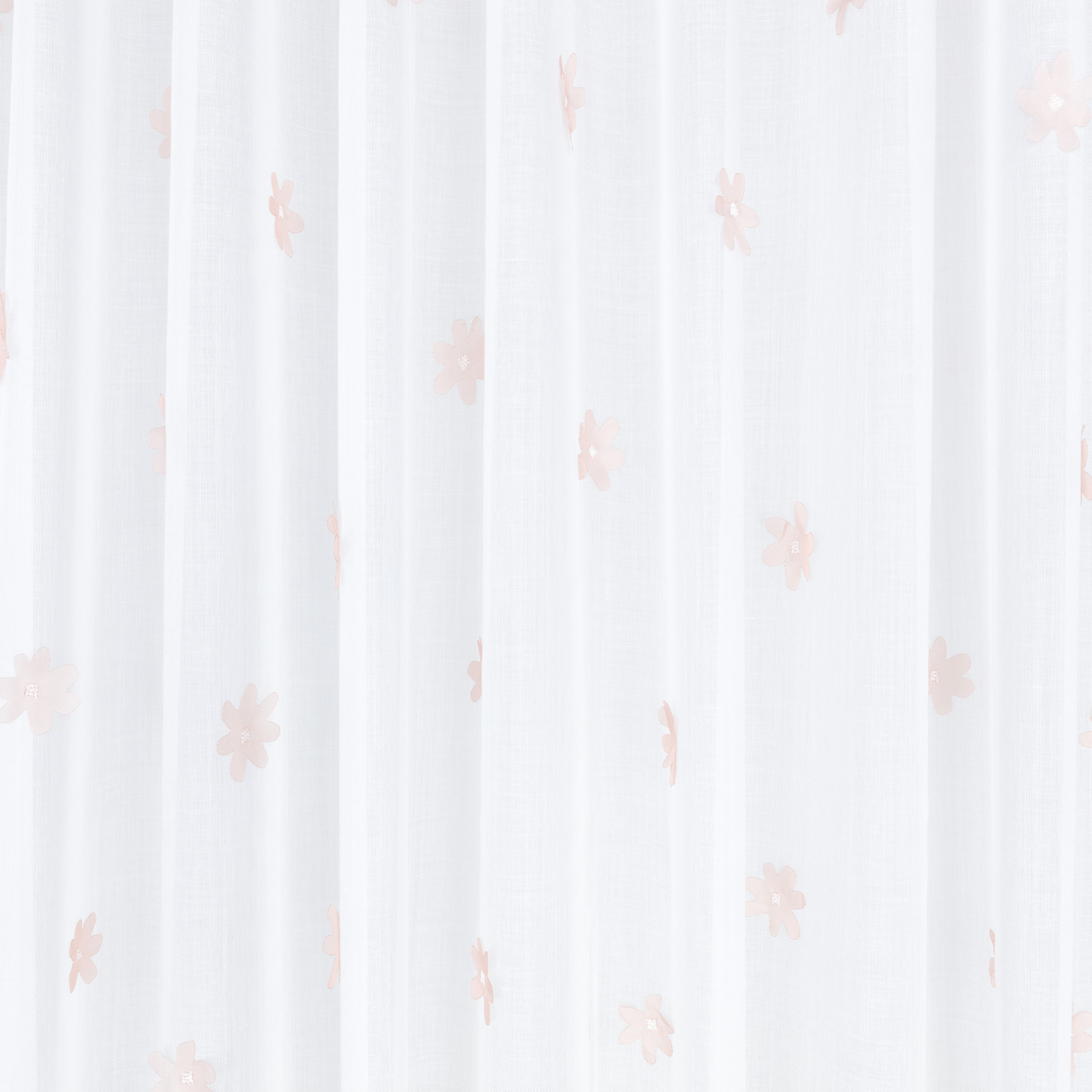Zarte, rosafarbene Blumen mit lasergeschnittenen Blüten und gestickten Blütenstempeln, die sich anmutig über einen fein texturierten Stoff verteilen.