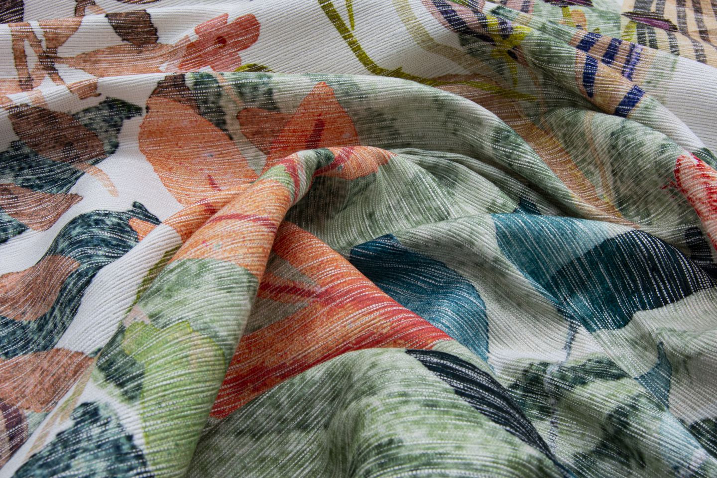 Ein sommerlich buntes Fest der Farben und Formen. Das Dessin ESTIVAL ist inspiriert von der naiven Formensprache der mexikanischen Kunst und Kultur. Von Hand aquarellierte Blüten und Blätter tanzen in fröhlicher Formation über die von Hand gewebte Grundware. Das Motiv wird im Transferdruckverfahren aufgetragen. Durch die Verwendung einer Polyesterfaser, die den Farbstoff nicht annimmt, werden bewusst einige Stellen ausgespart. Es entsteht ein schöner Effekt, der den künstlerischen Charakter von ESTIVAL unterstreicht. In beiden Farbstellungen wurde die Menge der verwendeten Polyesterfasern dem gewünschten Farbeindruck angepasst. Neben der sommerlichen Farbstellung gibt es ESTIVAL auch in einer sehr sanften neutralen Farbigkeit.