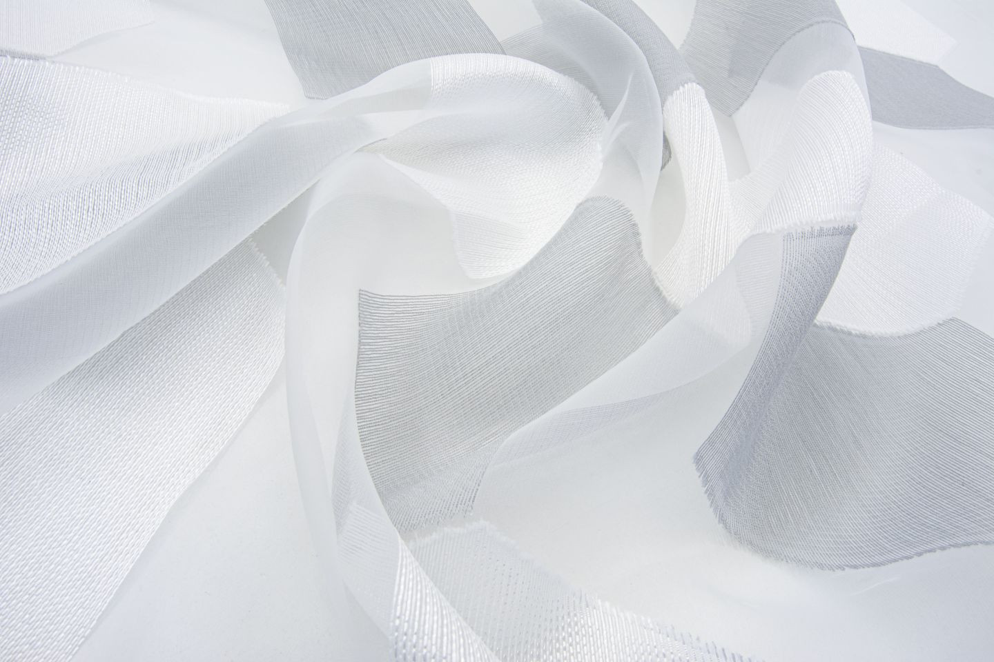 ANAHI ist ein raumhoher Trevira CS-Organza mit grafischem, zweifarbigen Scherli-Muster. Zur Farbpalette gehören leuchtende Farbtöne wie Gelb und Terrakotta sowie Reinweiß.
