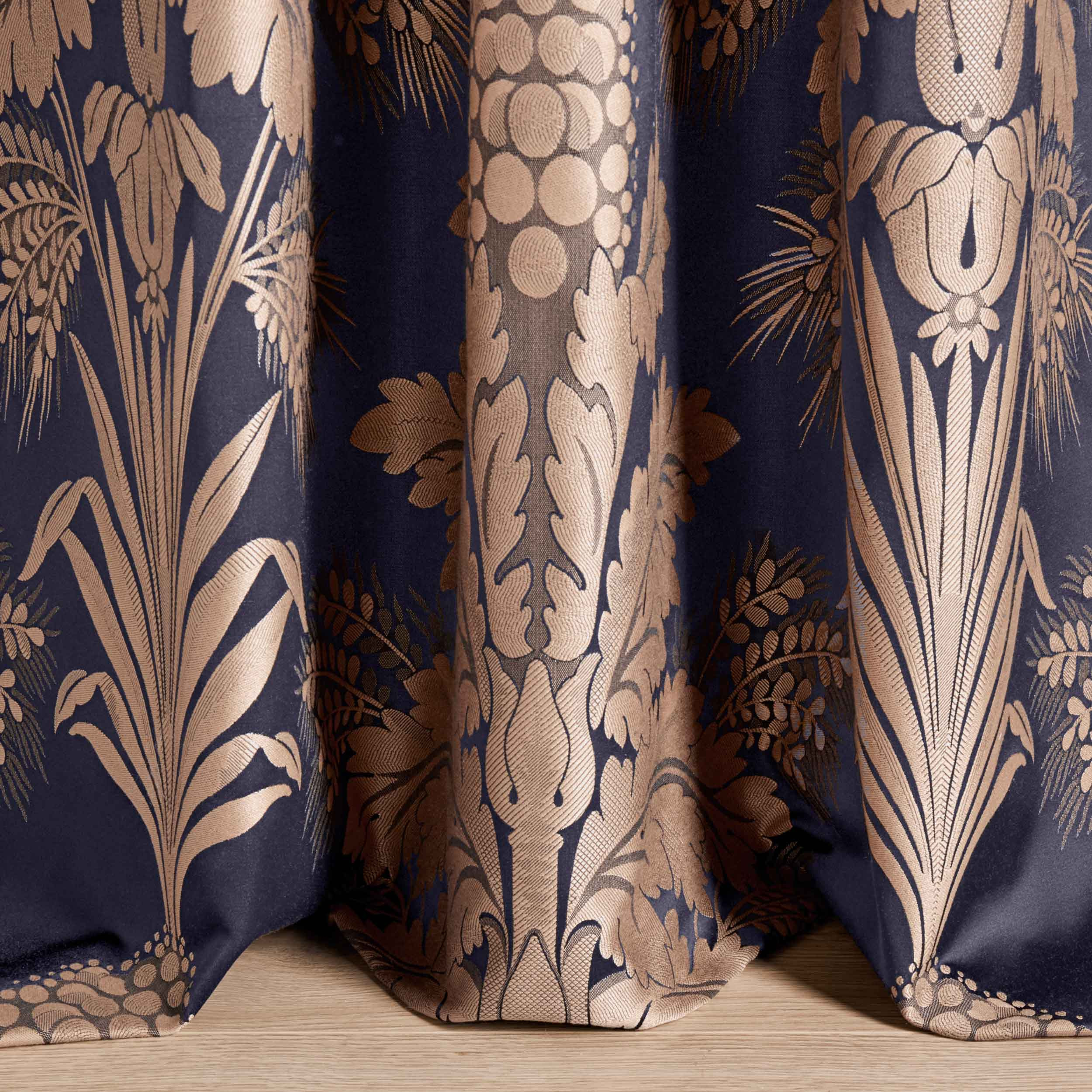 Dieses Jacquard Gewebe aus 100% Trevira CS hat das Aussehen eines Baumwoll oder Seiden Damastes. Das großzügige klassisch ornamentale Muster tritt durch eine Vielzahl verschiedener Bindungen zum Vorschein. Es hebt sich matt vom elegant glänzenden Kettsatin ab. Sieben natürliche und opulente Farben.