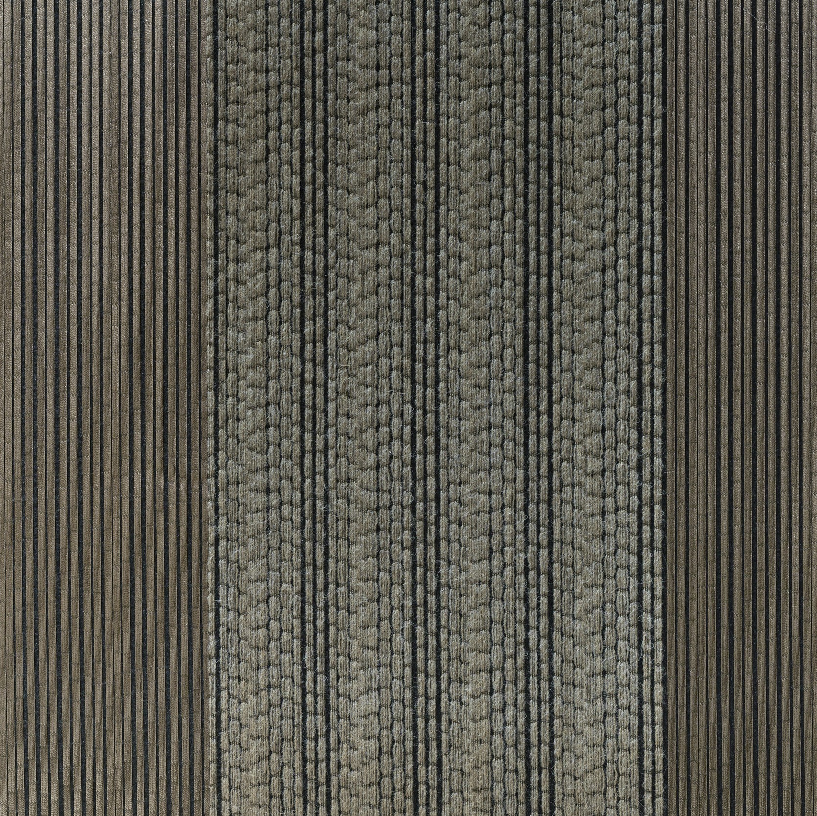 CALLA STRIPE ist ein raumhoher Vorhang mit vertikalen Streifen, bei denen sich matte und halb glänzende Bereiche mit großen Schuss-Flottierungen abwechseln. Der Materialkontrast entsteht einerseits durch die Woll- und Alpaka-Mischgarne sowie andererseits durch ein glänzendes Garn, die farblich aufeinander abgestimmt sind und jeweils zusammen einen breiten Streifen bilden. Es sind fünf Kolorits erhältlich, zeitlose Naturtönen, von hell bis dunkel.