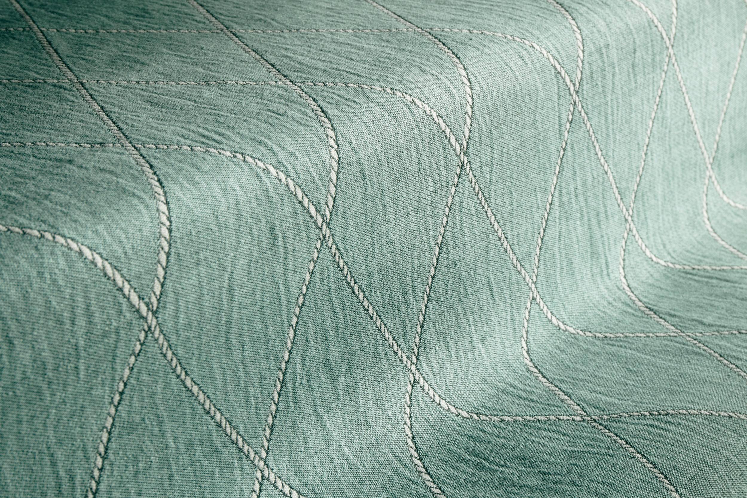 Dieses maritim inspirierte Design zeichnet sich durch einen großflächigen Rautenjacquard aus, der sich durch die Verflechtung von Kette und Schuss auszeichnet. Am auffälligsten sind die weißen Umrisse der Rauten, die einen seilartigen Effekt mit einem fast dreidimensionalen Aussehen erzeugen. Erhältlich in fünf Farben.