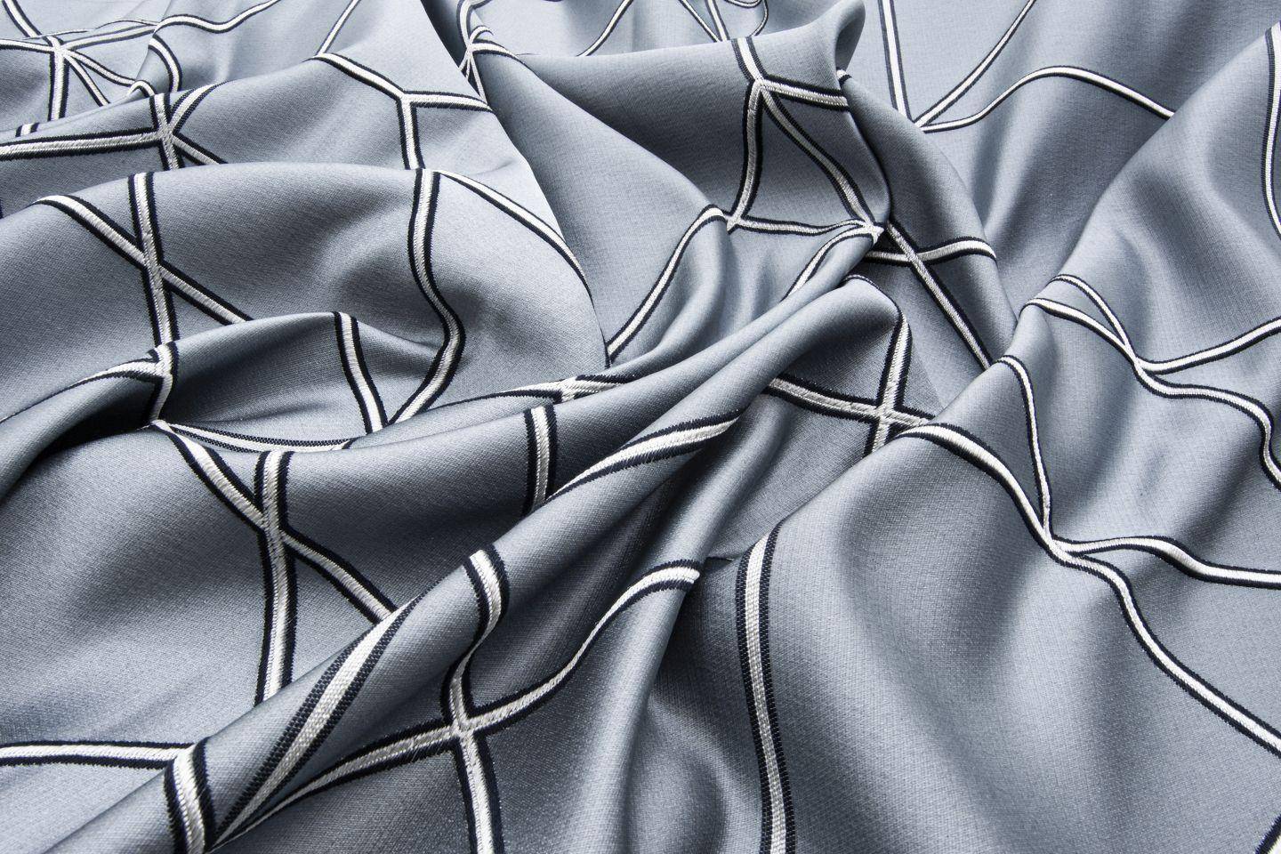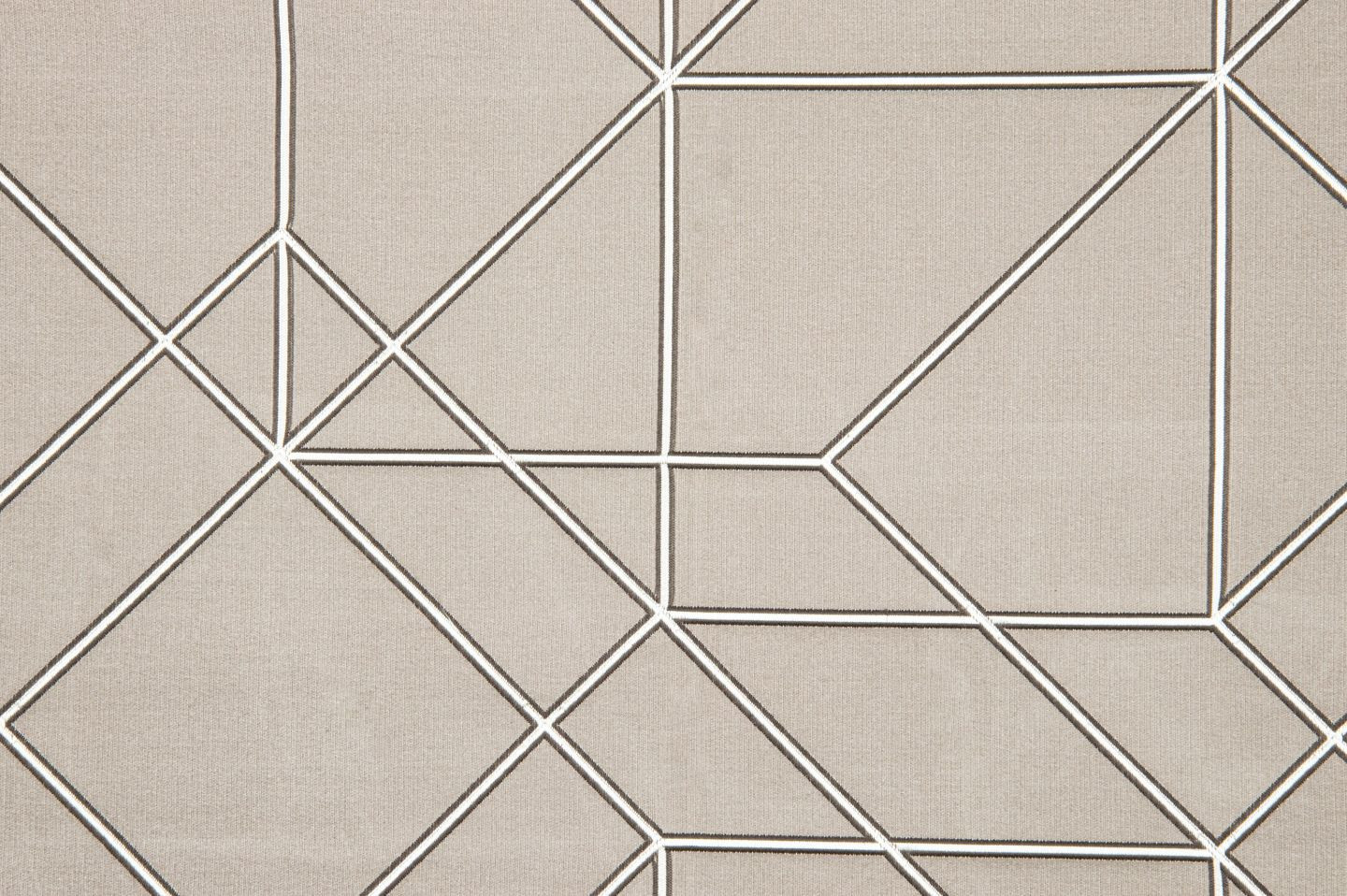 Ein lineares grafisches Muster ziert die raumhohe Polyesterqualität CONTOUR. Der Jacquard überzeugt durch seinen weichen Fall und den dezenten Glanz.