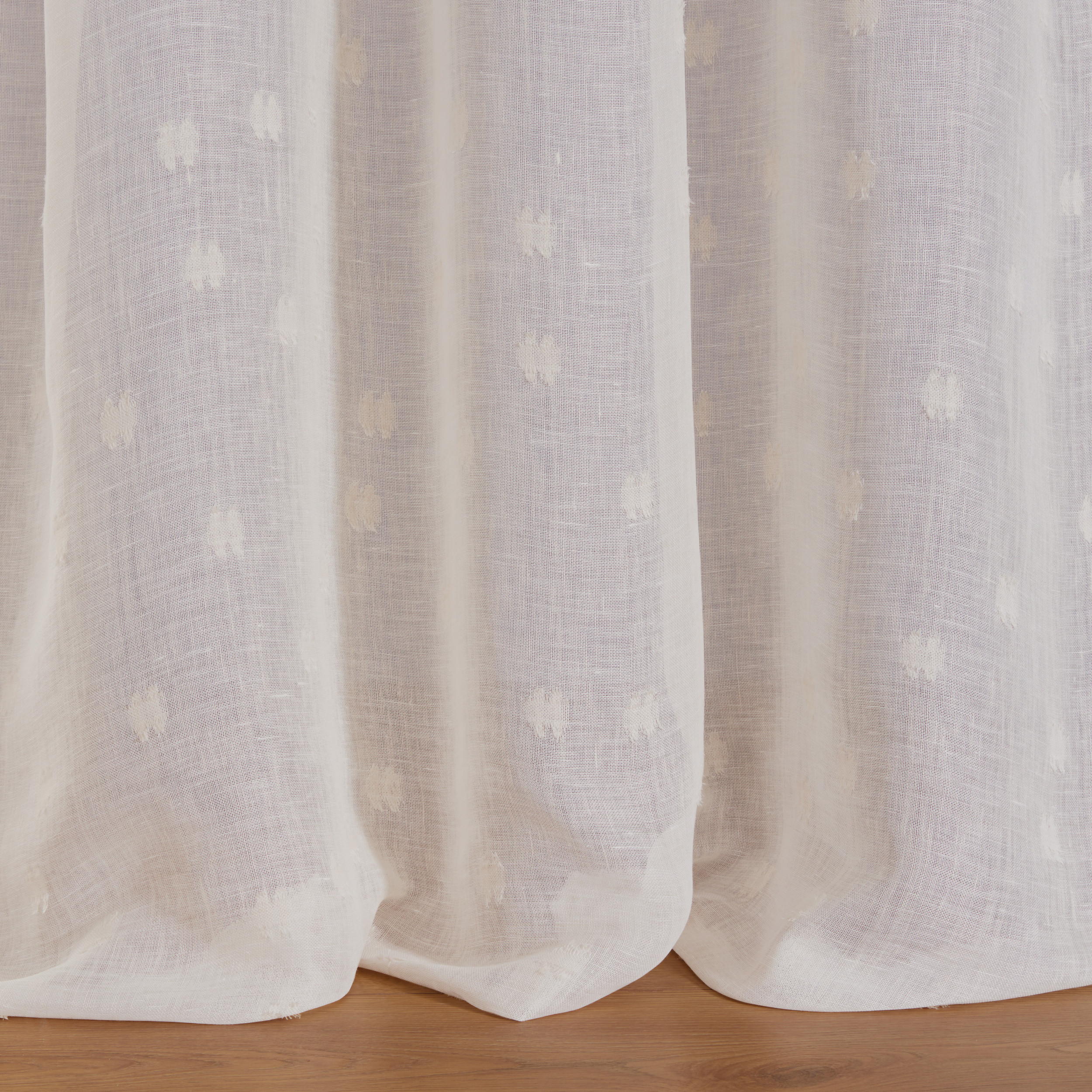 CRAFTED ECHOES ist ein doppelt breites, halbtransparentes Gewebe aus 100% Hanffasern, das in 6 Farben erhältlich ist. Das Punktemuster in Scherli Technik wirkt wie zufällig über die ganze Breite des Stoffes arrangiert.