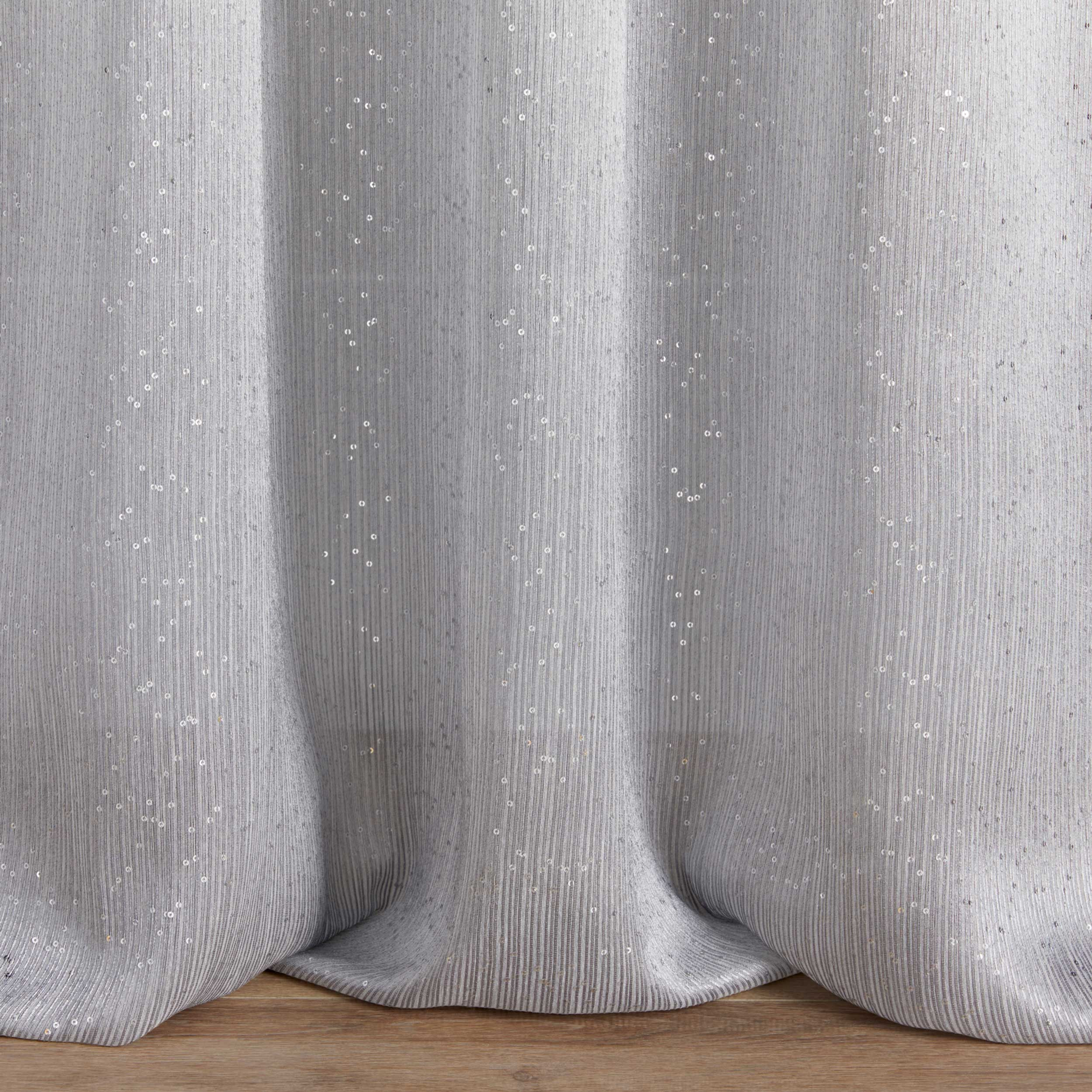 Der leichte ,halbtransparente und doppelt Breite Vorhangstoff CRISTALLI glitzert mit vielen kleinen Lichtpunkten, die durch reflektierende Pailletten erzeugt werden, ein Gestaltungselement, das normalerweise in der Mode verwendet wird. Die Pailletten werden nicht einfach aufgestickt, sondern auf die Schussfäden aufgezogen, eingedreht und mit einer besonderen Webtechnik verwebt, wodurch eine Art Nadelstreifen-Optik mit einem unregelmäßigen Lichteffekt entsteht. Die Farbvarianten reichen von neutralen Tönen bis hin zu einem tiefen Blau.