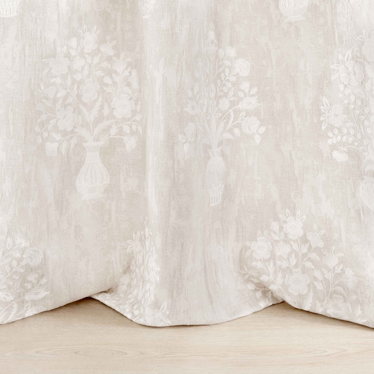 EPOQUE ist ein floral bestickter, dekorativer Stoff, der sich als Vorhang sowie für leichte Polsterungen eignet. Die Grundqualität aus einem Baumwoll-Leinen-Gemisch ist ein Faux-Jacquard mit einer unregelmäßigen Patina-Textur. Neben einem dezent weissen Ton-in-Ton-Kolorit sind weitere sanfte Farbgebungen der Grundware in Taubengrau und Hellgrau erhältlich, jeweils weiss bestickt.
