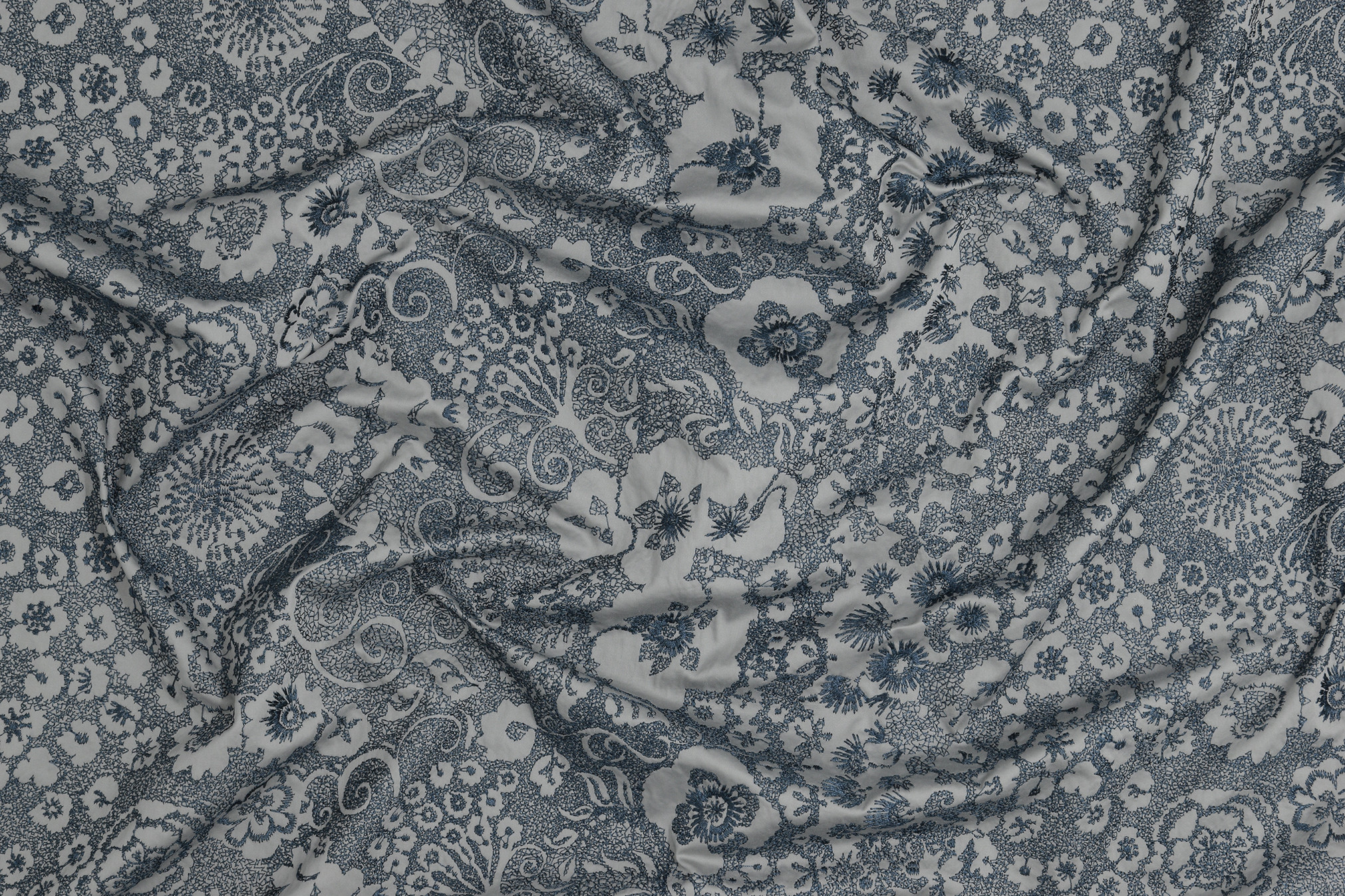 Mit ÉTUDE präsentiert Christian Fischbacher ein klassisches Blumenmotiv in modernem Look. Die abstrahierten Blüten bilden sich nicht durch die Stickerei selbst. Wie in einem Negativ entwickelt sich der Rapport innerhalb der bestickten Flächen, deren Linienführung sehr frei, fast wie handgezeichnet wirkt. Die Stickerei erfolgt auf einer Mehrkopf-Stickmaschine mit Viskosegarn. Die textile Grundfläche bildet ein hochwertiger 100%iger Baumwollsatin. ÉTUDE kann ungefüttert verarbeitet werden und verfügt dank der flächigen Stickerei über einen kompakten Griff. Einmal mehr geht Christian Fischbacher auch bei klassischen Textilien ganz neue Wege und lässt moderne Interpretationen traditioneller Textilwelten entstehen.