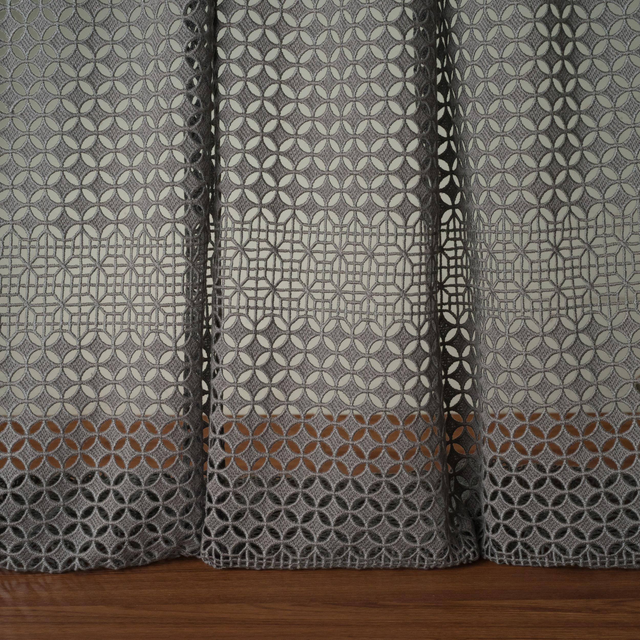 GLORIOSA ist eine doppelt breite Ätzspitze, die in Querstreifen angeordnet zwei kleine grafische Muster von Stickereimustern zeigt. Ein Muster ist linear und filigran, das andere dichter. Die Querstreifen sind 17cm breit. Es wird empfohlen, den Vorhang aufstehend zu konfektionieren. GLORIOSA wird in vier Farben angeboten.