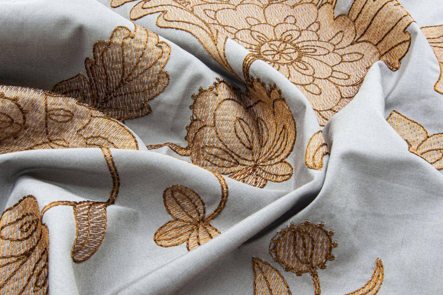 Das florale Dessin LEORA ist inspiriert von der traditionellen persischen Textilkunst. Es wird jedoch durch eine einfache monochrome Linienzeichnung zeitgemäß umgesetzt. Diese wird durch die Stickerei perfekt und mit hoher Präzision auf einen Baumwoll-Seidengrund übertragen. Die Mischung der kostbaren Materialien erzeugt den subtilen Glanz.