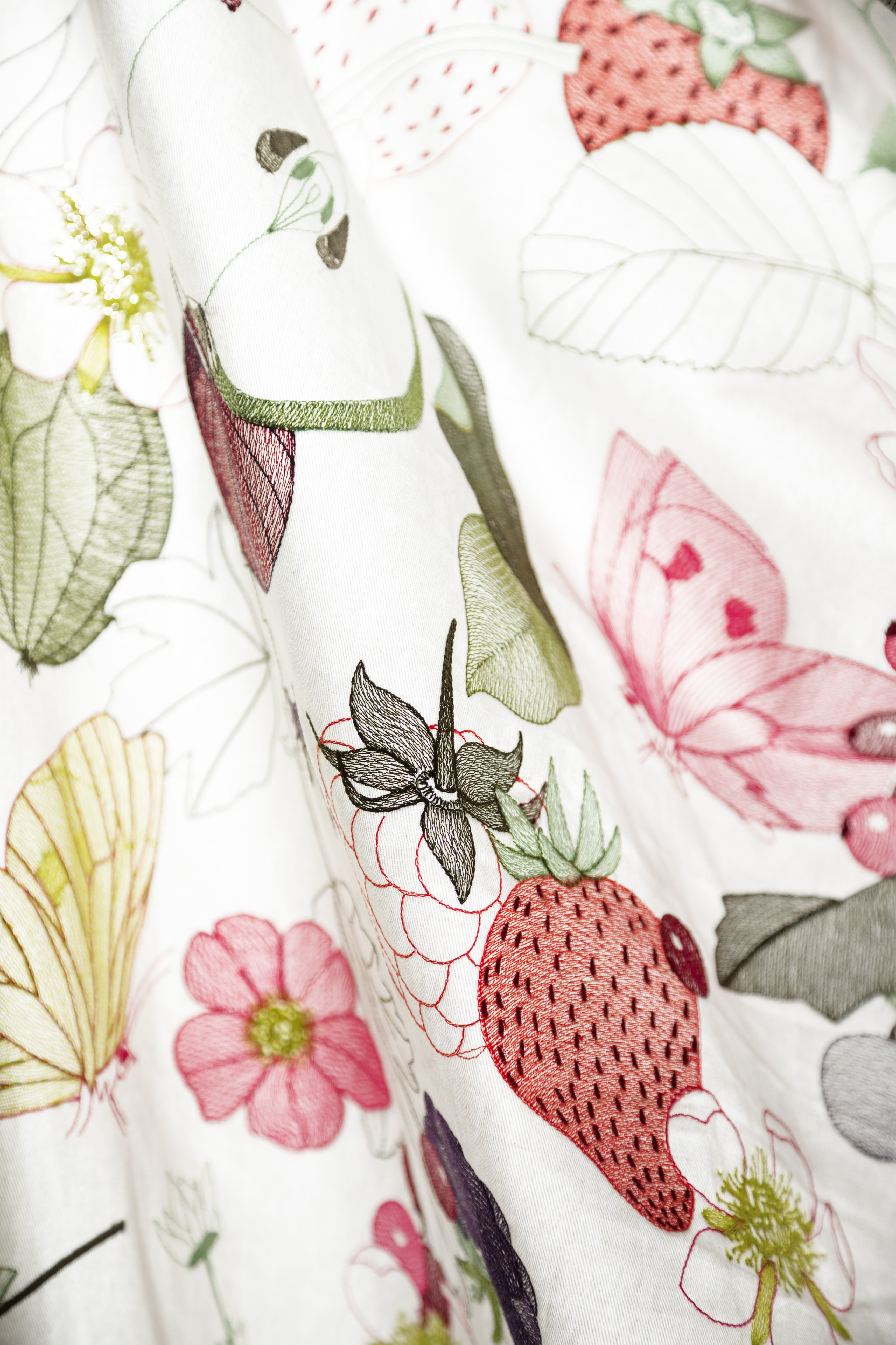 Das Design Marmelade wurde im Atelier von Christian Fischbacher von Hand gezeichnet und zeigt die Liebe zum Detail in Kombination von Tradition und Moderne. Die Umsetzung auf dem Baumwollköper erfolgt als Flachstickerei. Langsames Sticken der einzelnen Nadeln und der Einsatz des feinen Viskosegarns sorgen für die hohe Qualität des Textils.