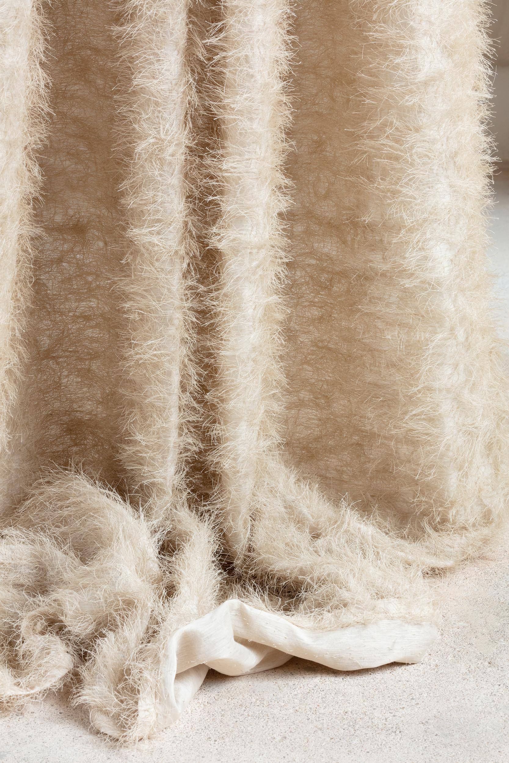 PASTORAL WEAVE ist ein extravaganter Vorhang, der die Anmutung eines Felles hat. Auf einer zarten Seidenkette werden die Hanfgarne mit außergewöhnlich langen Flottierungen eingewebt und später im Scherli-Verfahren aufgeschnitten. Eine besondere Veredelung bringt die Fäden in Richtung und sorgt für Volumen.