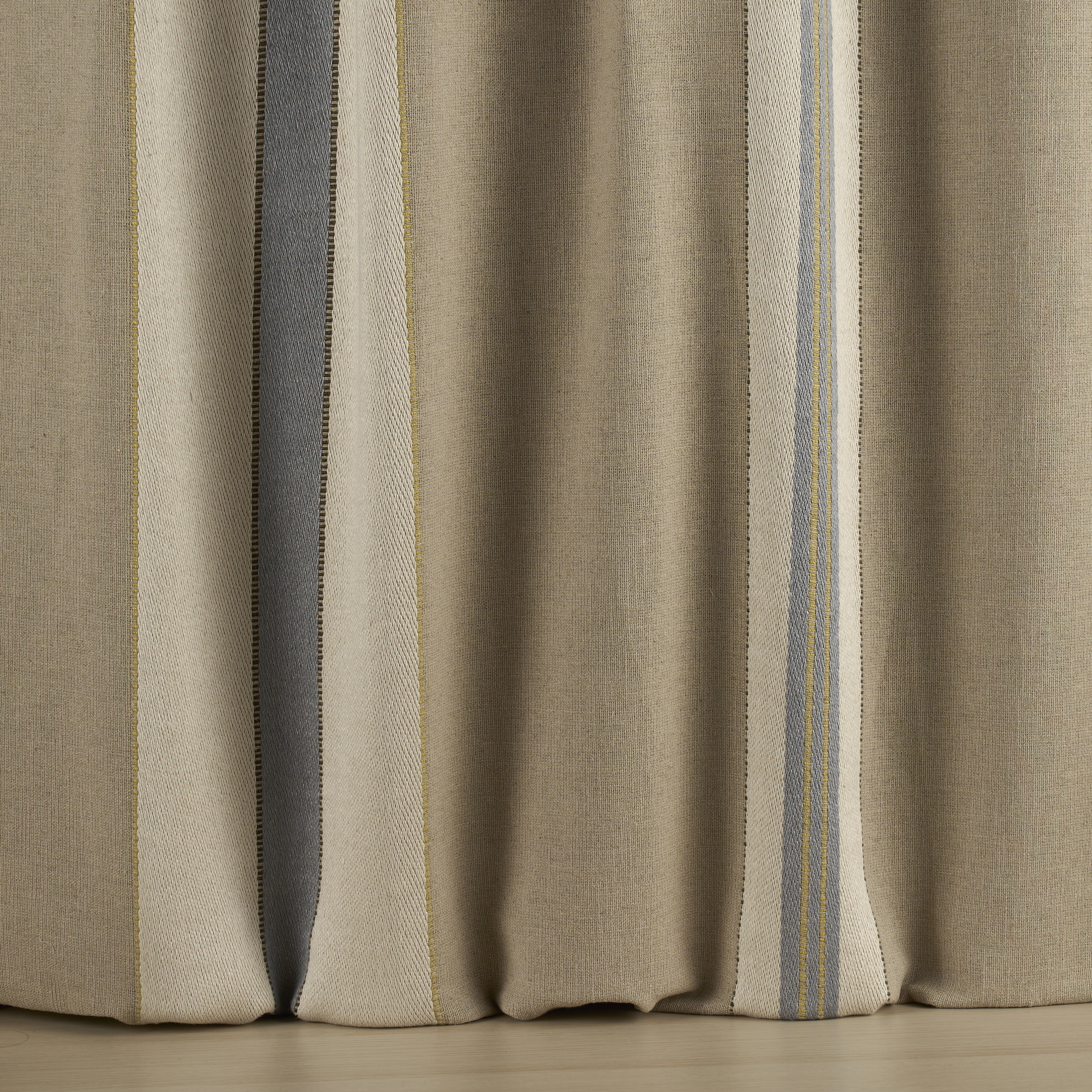 Das charakteristische Merkmal dieses Stoffes ist sein breites, gewebtes Streifenmuster, das der Oberfläche eine besondere Struktur und Tiefe verleiht. Der natürliche Leinenhintergrund verstärkt die natürliche Haptik und hebt die natürliche Schönheit des Materials hervor. Dieser Dekostoff fügt sich harmonisch in moderne wie klassische Interieurs ein.