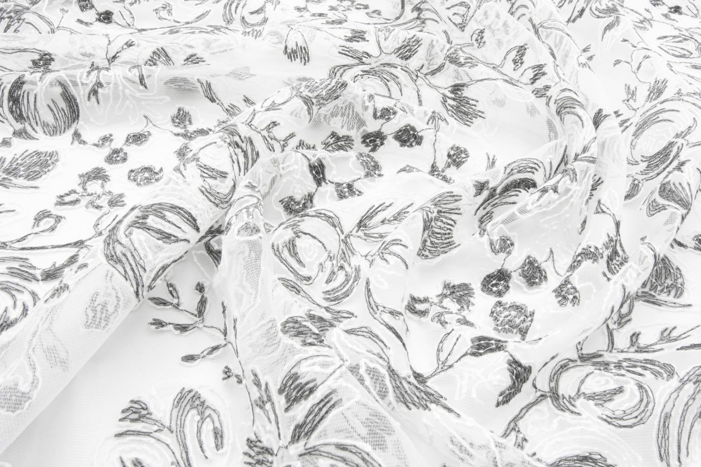 ROSAS ist die Trendversion einer romantischen Stickerei. Über die gesamte Höhe wurde der Dreher-Organza mit zweifarbigen Rosen bestickt. Die elegante Farbpalette umfasst zahlreiche raffinierte Farbvarianten auf weißem oder schwarzem Hintergrund.
