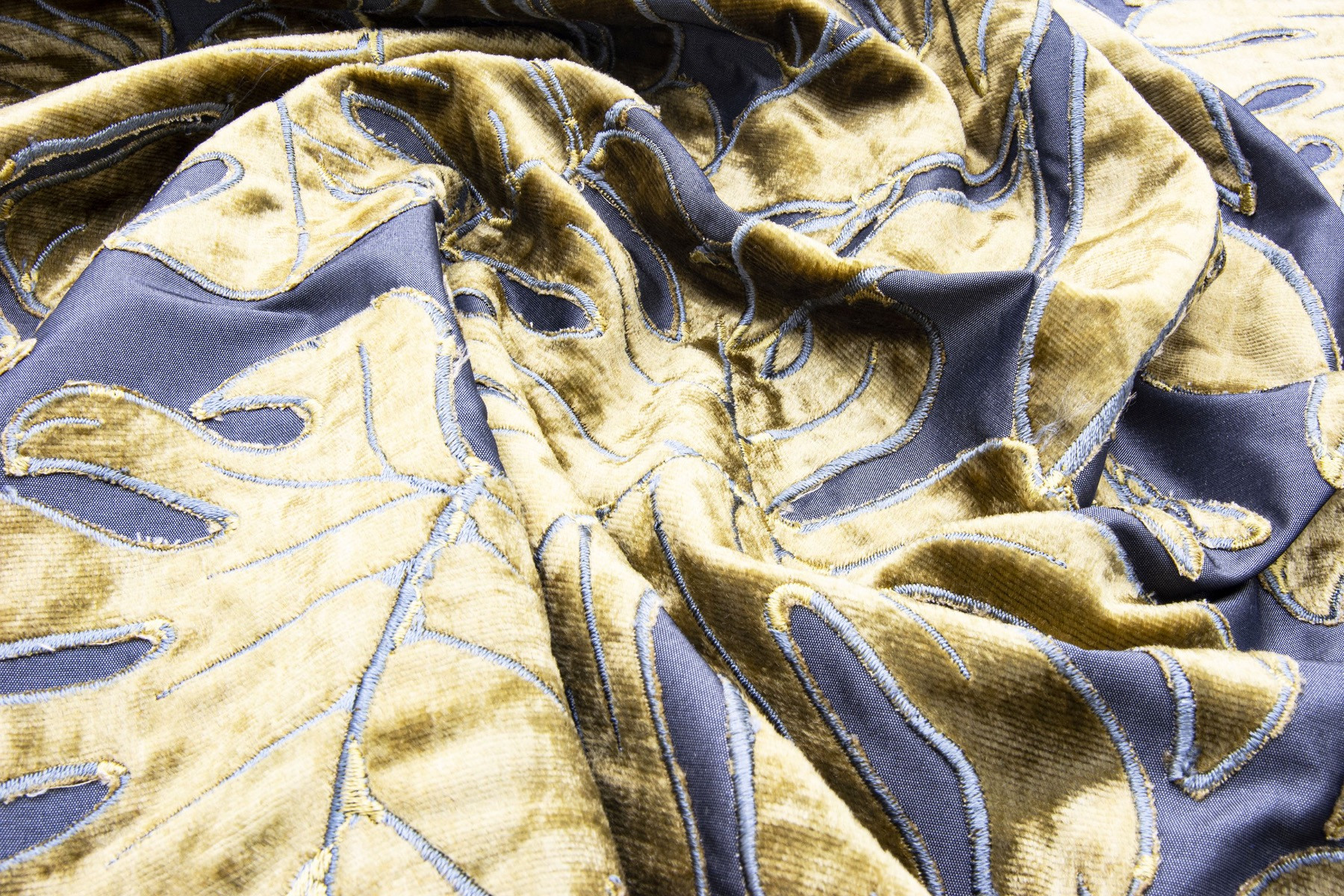 SELVA bringt den tropischen Regenwald ans Fenster. In aufwendiger Handarbeit wird das Blattmotiv in Form einer Applizierung aufgebracht. Wir verwenden dafür einen geschmeidigen Samt und kombinieren ihn mit einem weich fließenden Polyestertaft. Durch den natürlichen Spiegel des Samtes sowie der bewusst gewählten Zweifarbigkeit der Stickerei wirkt SELVA sehr lebendig und je nach Kolorit elegant opulent bis tropisch intensiv.