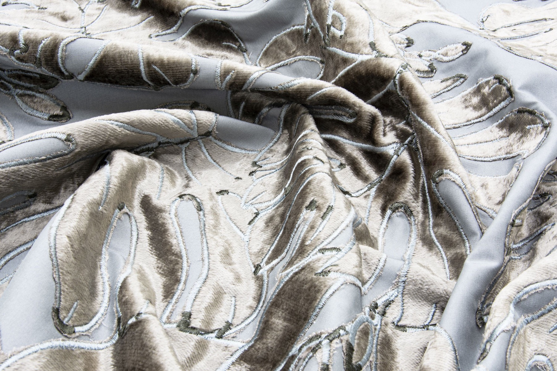 SELVA bringt den tropischen Regenwald ans Fenster. In aufwendiger Handarbeit wird das Blattmotiv in Form einer Applizierung aufgebracht. Wir verwenden dafür einen geschmeidigen Samt und kombinieren ihn mit einem weich fließenden Polyestertaft. Durch den natürlichen Spiegel des Samtes sowie der bewusst gewählten Zweifarbigkeit der Stickerei wirkt SELVA sehr lebendig und je nach Kolorit elegant opulent bis tropisch intensiv.