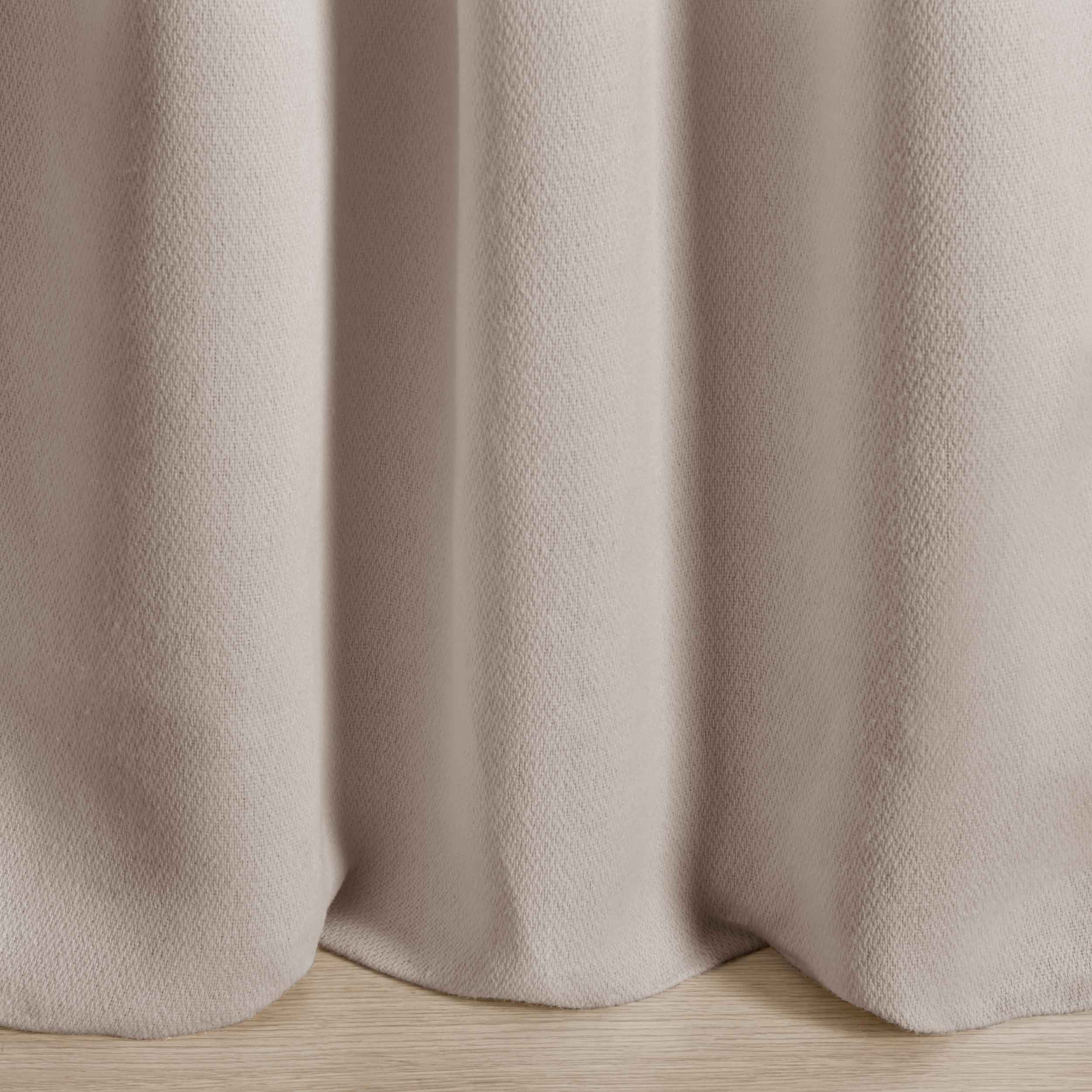 Der natürliche, aus 100% Leinen bestehende raumhohe Vorhang ist garngefärbt und kann von beiden Seiten genutzt werden. Durch die verschiedenen Farben von Kette und Schuss, sowie der unterschiedlichen Bindungen entsteht auf jeder Seite des Gewebes eine eigene Struktur und Farbigkeit.
