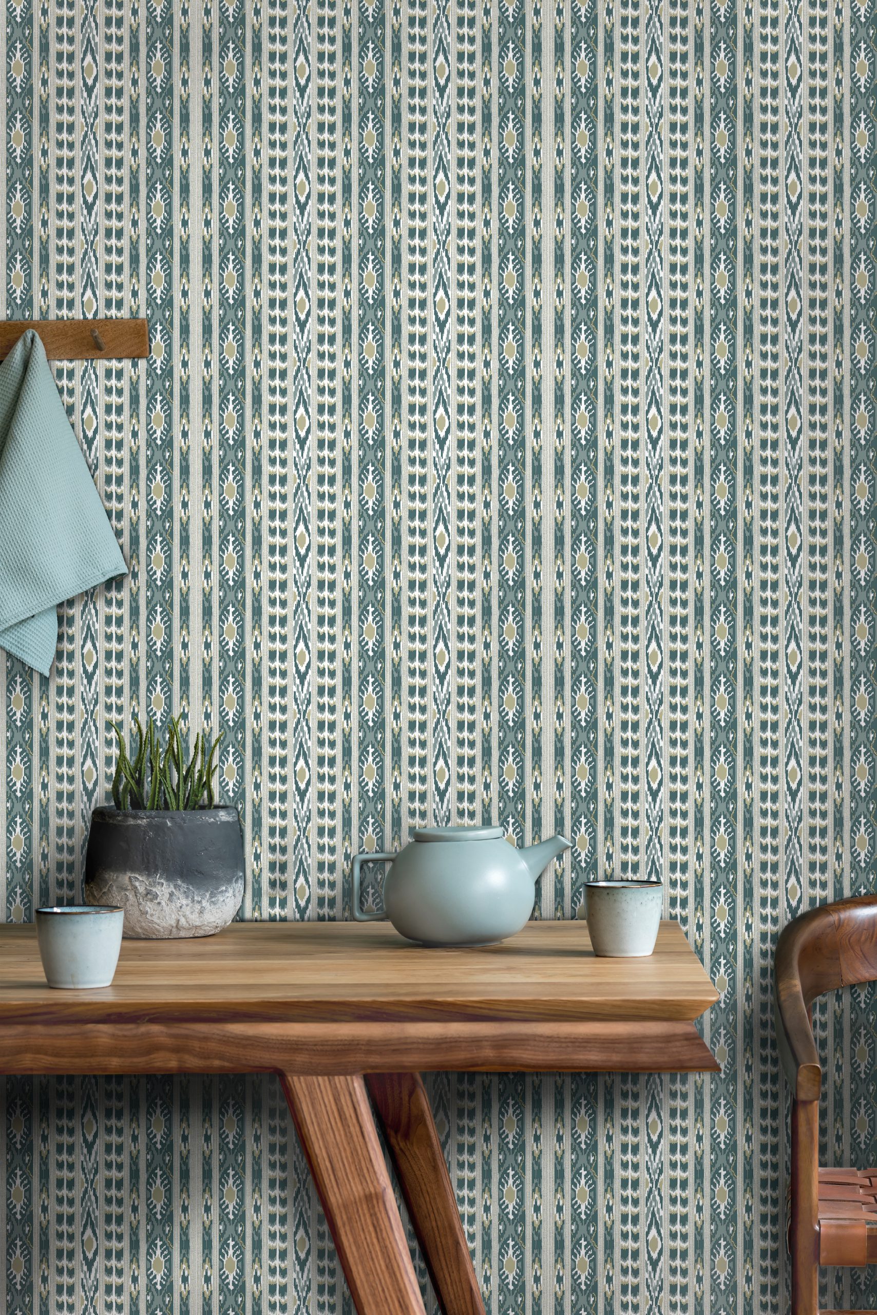 The Apache wallpaper from Gastón y Daniela brings a dynamic ethnic design to the wall that is inspired by traditional patterns from indigenous cultures. The repeating motif features sharp-edged geometric shapes - including zigzag lines, triangles and stylized arrows - that are interlocked and arranged to create a powerful, graphically impressive overall picture. The arrangement is reminiscent of hand-woven textiles or decorative tapestries, such as those found in Latin American or North American cultures. Despite the clear lines, the design exudes a certain handcrafted warmth and authenticity. The regular repetition creates a strong visual structure and gives rooms depth and character. Manufactured on a robust non-woven backing, Apache is easy to work with and ensures long-lasting aesthetics.ik on accent walls or in modern boho interiors