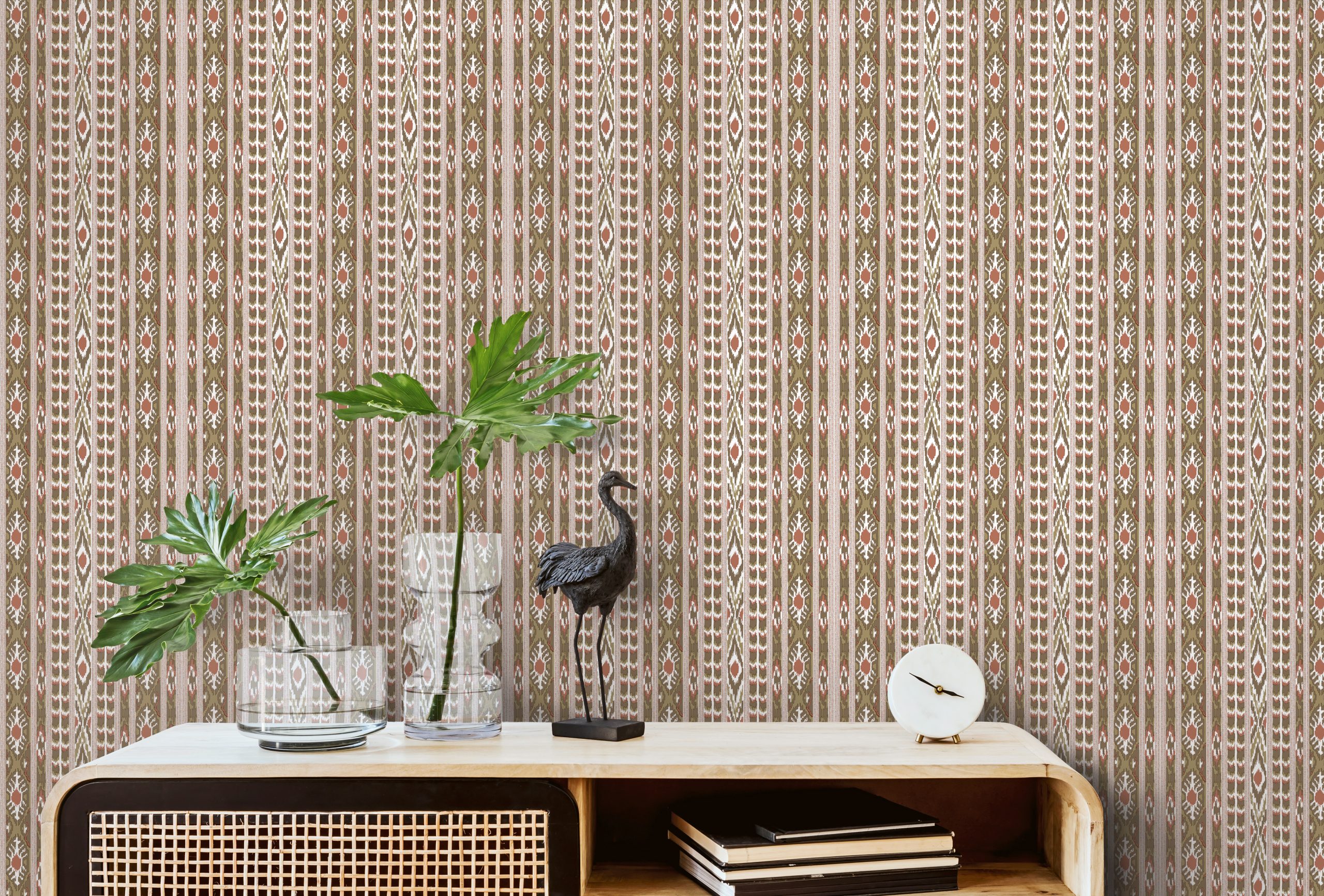 The Apache wallpaper from Gastón y Daniela brings a dynamic ethnic design to the wall that is inspired by traditional patterns from indigenous cultures. The repeating motif features sharp-edged geometric shapes - including zigzag lines, triangles and stylized arrows - that are interlocked and arranged to create a powerful, graphically impressive overall picture. The arrangement is reminiscent of hand-woven textiles or decorative tapestries, such as those found in Latin American or North American cultures. Despite the clear lines, the design exudes a certain handcrafted warmth and authenticity. The regular repetition creates a strong visual structure and gives rooms depth and character. Manufactured on a robust non-woven backing, Apache is easy to work with and ensures long-lasting aesthetics.ik on accent walls or in modern boho interiors
