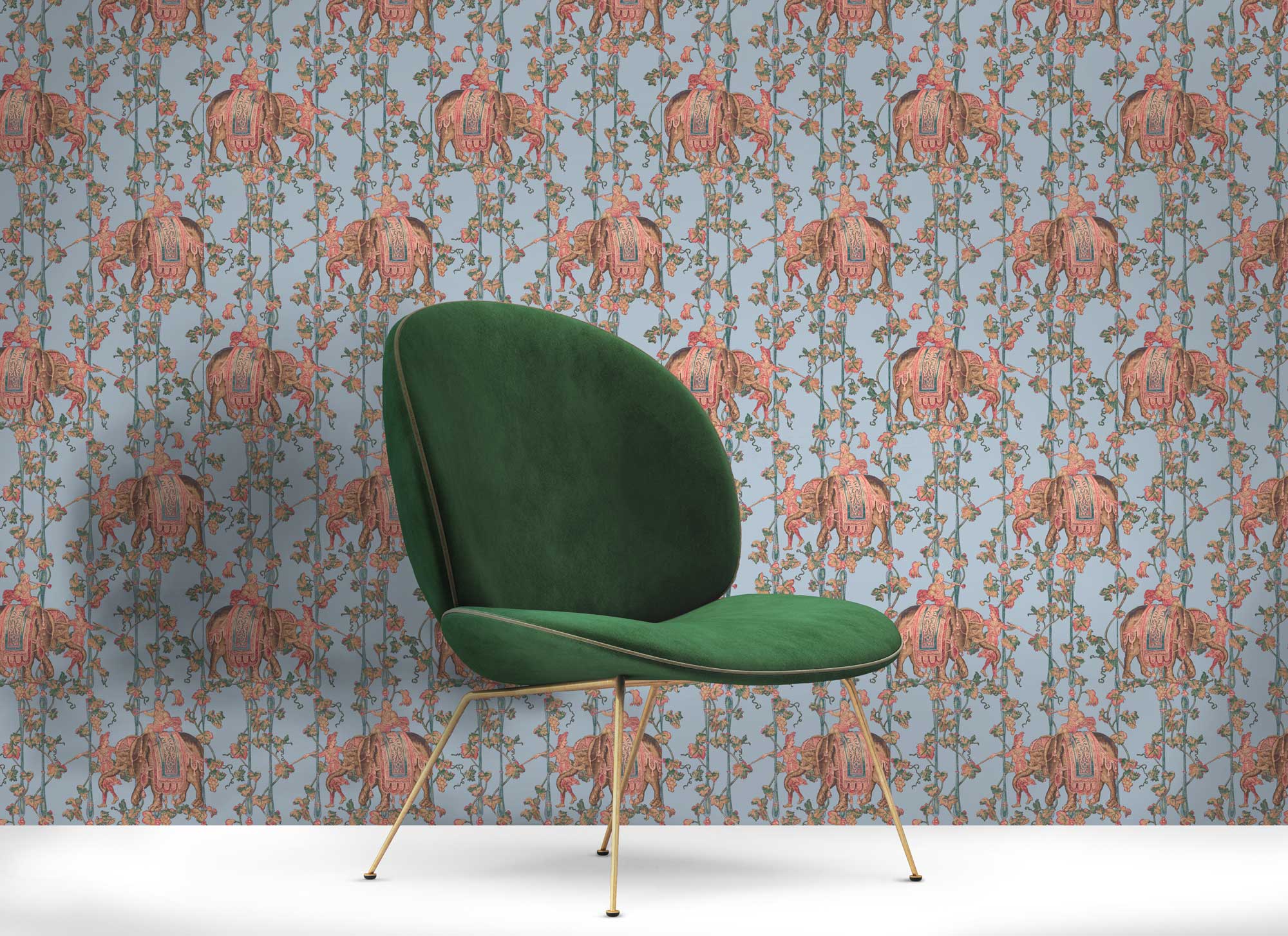 This wallpaper is ideal for rooms where an exotic, warm atmosphere is desired - whether in the living room, bedroom or creative area. The Indian-inspired elephant motif gives the room a feeling of cosmopolitanism, sophistication and decorative lightness