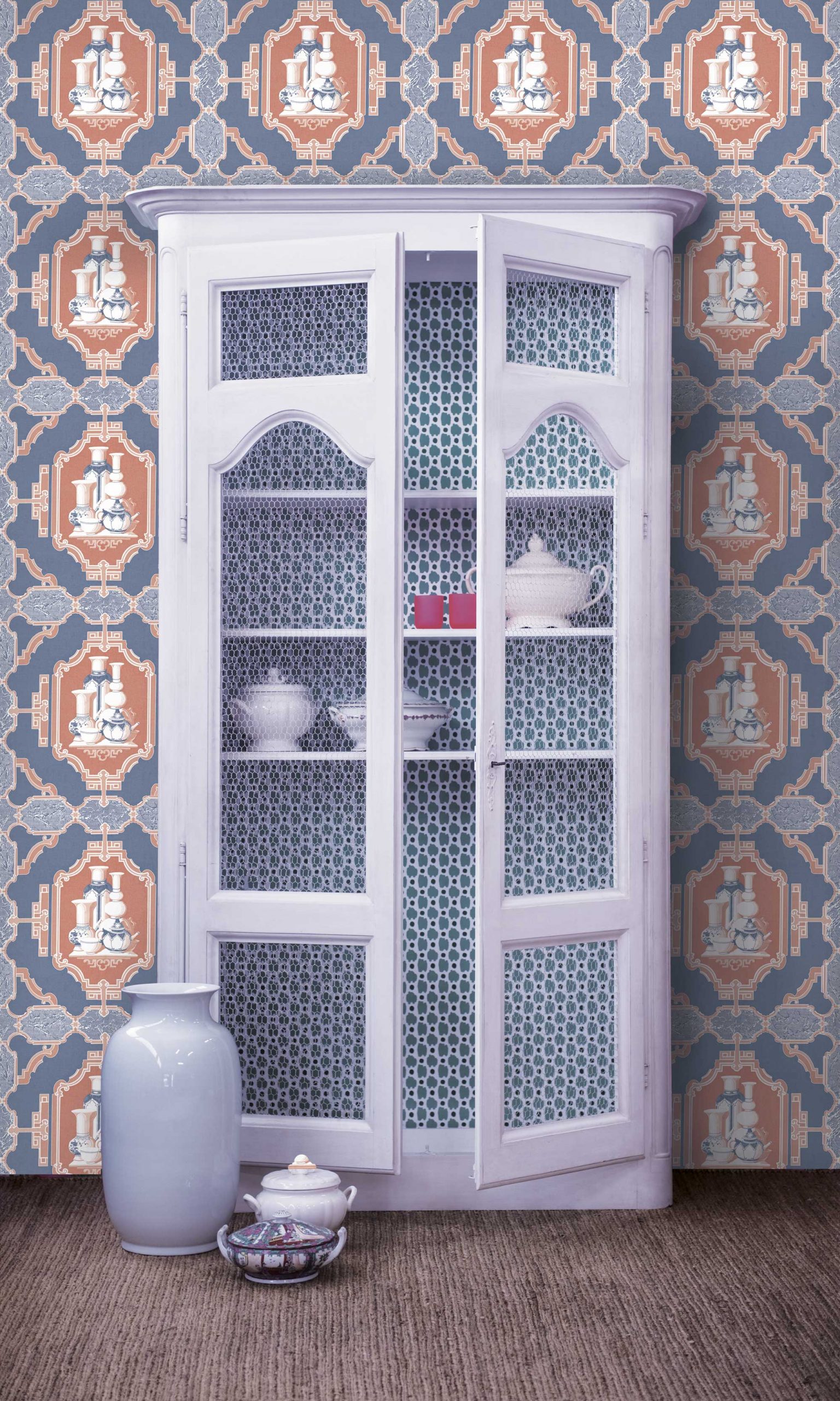 The Porcelanas wallpaper from the Librería collection by Gastón y Daniela shows a recurring motif of artfully drawn porcelain objects in a stylized representation. The design is reminiscent of decorative collections of antique ceramics, such as those found in historical interiors or traditional pharmacy shelves, and depicts various Asian vases, teapots and lidded vessels arranged next to each other in a harmonious sequence. The motifs are rich in detail, decorated with floral ornaments and geometric borders. The repeated, symmetrical arrangement gives the wall a calm, orderly appearance with a nostalgic flair
