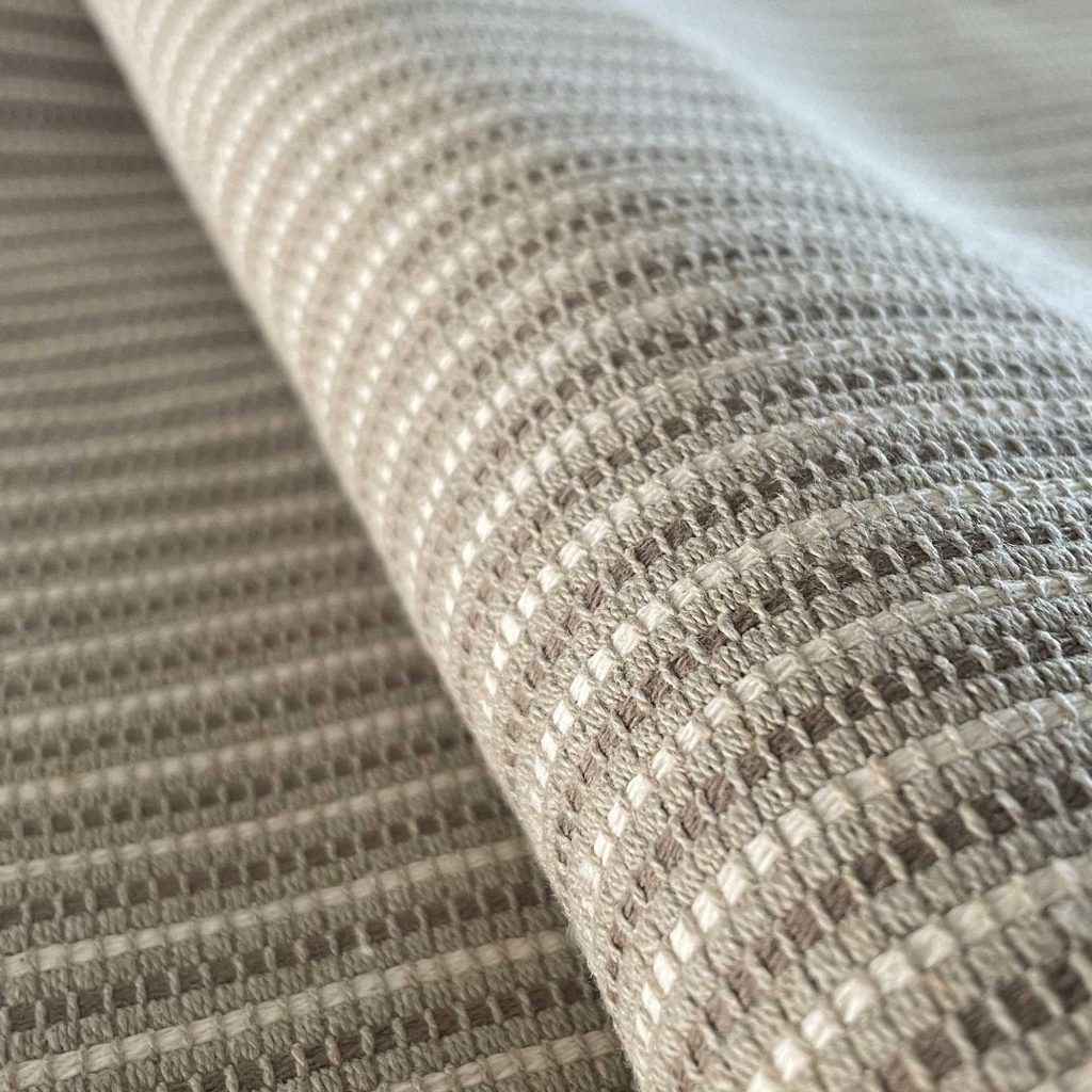 Die fein strukturierte Uni-Grundlage wird durch eine geradlinige, dezente Stickerei zu einem feinen Streifenmuster ergänzt – ein klares, grafisches Detail, das dem Stoff Charakter und Tiefe verleiht, ohne dabei aufdringlich zu wirken. „Shisha“ eignet sich hervorragend für Polsterarbeiten, Vorhänge, Kissenbezüge oder textile Wandgestaltungen.