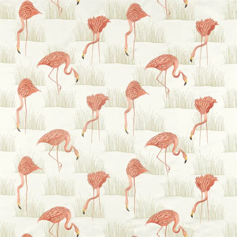 Das Design des Salinas-Stoffs zeigt kunstvoll gestickte Flamingos, die anmutig im flachen Wasser stehen. Die feine Stickerei verleiht dem Stoff eine strukturierte Tiefe und elegante Ausstrahlung. Die Farbpalette kombiniert natürliche Grundtöne mit sanften Akzenten, ideal für moderne, exotische oder naturnahe Interieurs. Der Stoff bringt Ruhe und Raffinesse in jeden Raum.