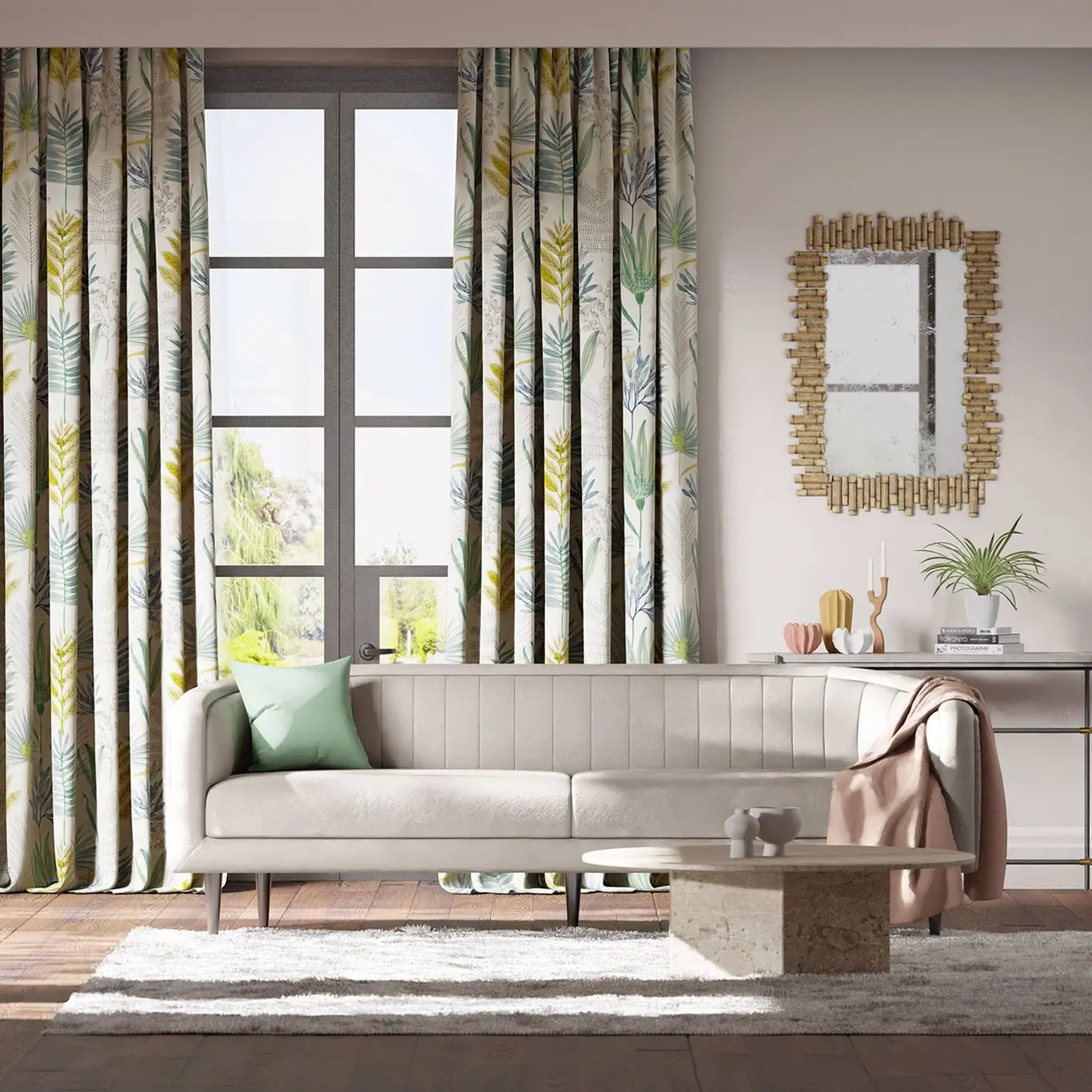Das einzigartige Muster des Stoffes besteht aus nach oben gerichteten, miteinander verflochtenen Blattmotiven. Dieses Muster kombiniert mit Tinte gezeichnete Blätter und bemalte Zweige, die von leuchtenden Akzenten durchzogen sind und eine leichte und lebendige Stimmung schaffen.