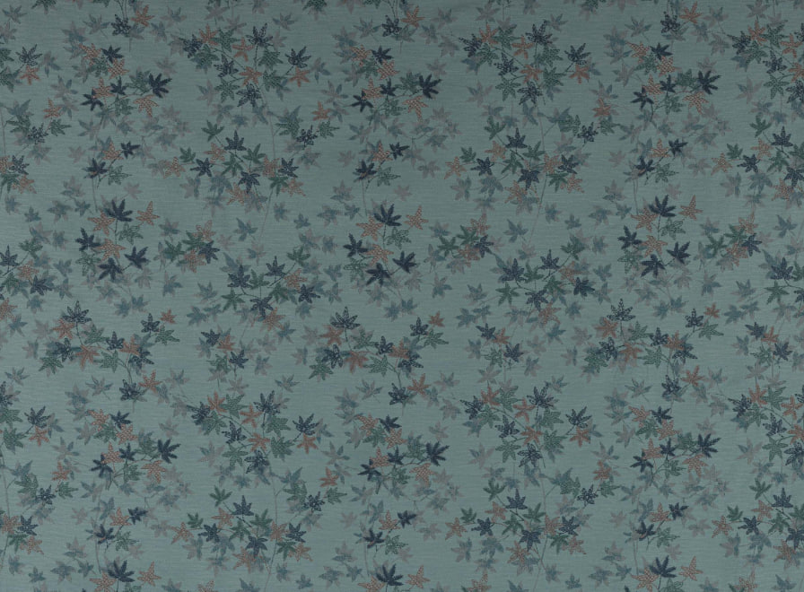 Dies ist ein vielschichtiger, auffälliger Stoff, der von den Mustern antiker Kimonos inspiriert ist und stilisierte Gruppen von Ahornblättern zeigt. Der strukturierte Jacquard-Grund aus gesprenkelten Blättern ist der perfekte Hintergrund für die üppigen Stickereien in einer Vielzahl von kontrastierenden Stichen.