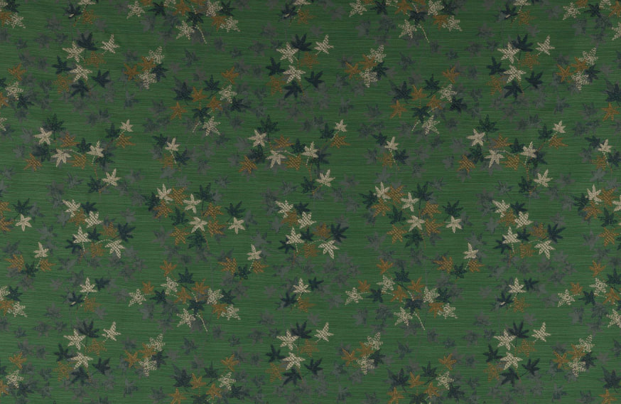 Dies ist ein vielschichtiger, auffälliger Stoff, der von den Mustern antiker Kimonos inspiriert ist und stilisierte Gruppen von Ahornblättern zeigt. Der strukturierte Jacquard-Grund aus gesprenkelten Blättern ist der perfekte Hintergrund für die üppigen Stickereien in einer Vielzahl von kontrastierenden Stichen.
