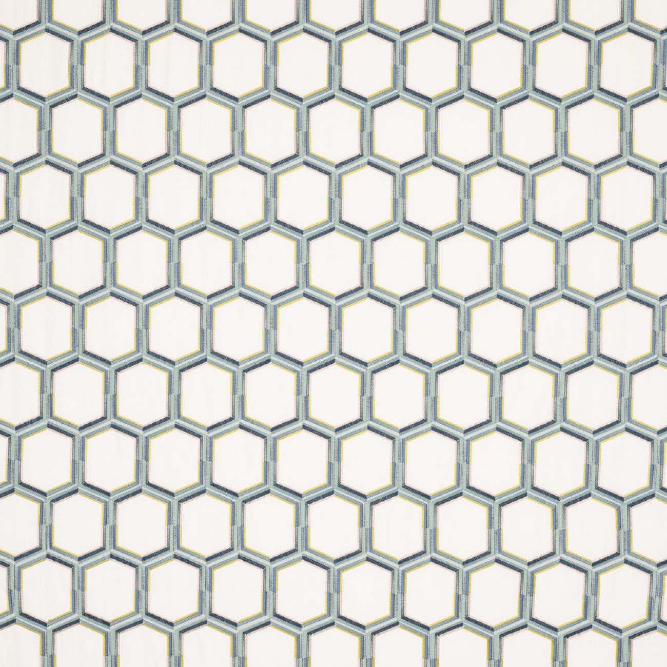 Diese zeitgenössische geometrische Stickerei mit einem Spalier aus aufwendig gestickten Sechsecken zelebriert das Zusammenspiel von matten und satinierten Garnen in lebendigen Farben.
