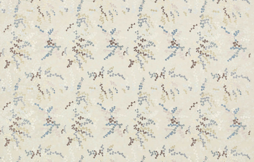Ein wunderschönes, feminines Muster mit Blütenzweigen auf einem sanft gefärbten Grund. Auch hier handelt es sich um einen vielschichtigen Stoff mit einem Jacquard-Grund, auf dem die Blumen mit Stickereien hervorgehoben werden. Die kleinen Blütenzweige, von denen einige gestickt wurden, um ihnen eine zusätzliche Dimension zu verleihen, enthüllen Farbspritzer. Erhältlich in verschiedenen Farbkombinationen und auch als Strukturtapete.