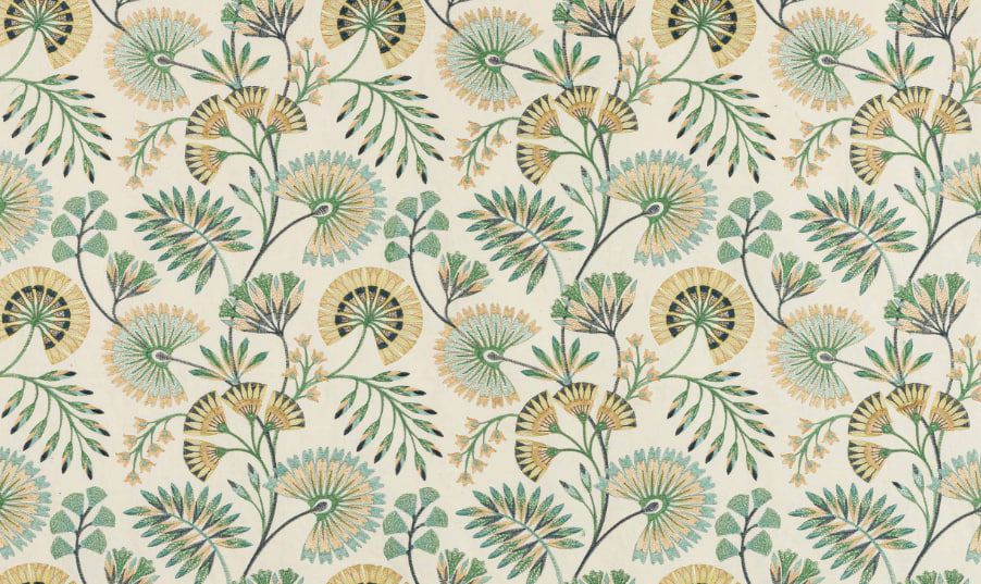 Chiana ist großzügig bestickt und zeigt eine wunderbare Reihe von stilisierten Blumen in einer Kombination verschiedener Stiche mit Bereichen von handgeschnittenen Details, die dreidimensionales Interesse hinzufügen.