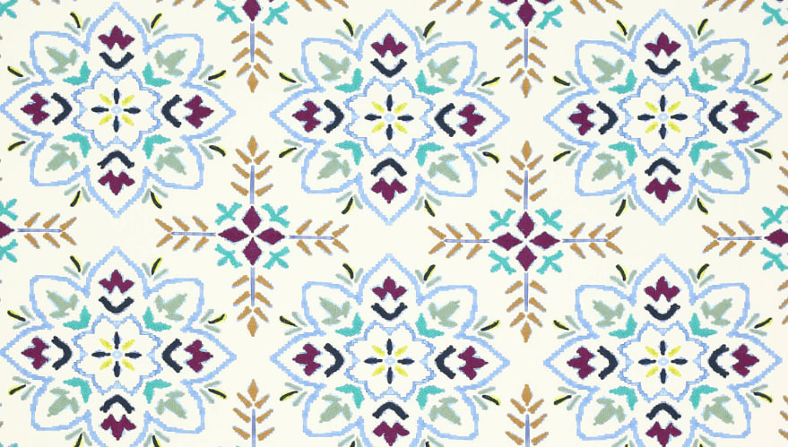 Eines der charakteristischen Designs dieser Kollektion. Chintal" kombiniert die geometrischen Muster von alten Keramikfliesen und gibt ihnen mit der Kombination aus Blockdruck und juwelenartigen Highlights der Kreppstickerei einen volkstümlichen Touch. Diese Kombination von Techniken und schrulligen Farbgebungen verleiht diesem Stoff einen handwerklichen Charakter, der sehr charmant ist.