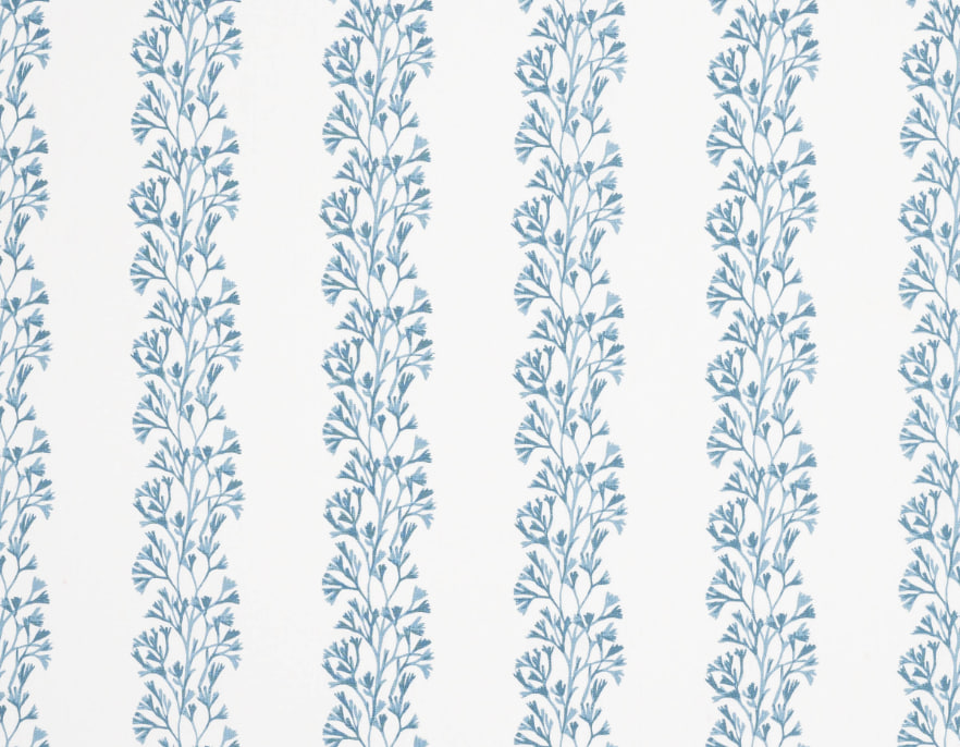 Ein lockerer, sich schlängelnder Streifen aus organischen Algenwedeln auf einem eleganten cremefarbenen Leinengrund, der einen frischen botanischen Effekt erzeugt und in zwei Farbtönen gedruckt wurde, um einen Blockdruck zu erzeugen.