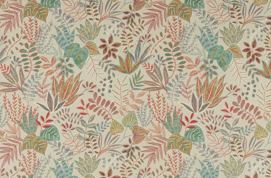 Ein fesselndes Design mit einer lebendigen Komposition aus stilisierten Dschungelblättern, die Muster und Farben in sich vereinen. Evangeline hat ein exotisches Flair mit einer reichhaltigen, vielfarbigen Farbpalette.