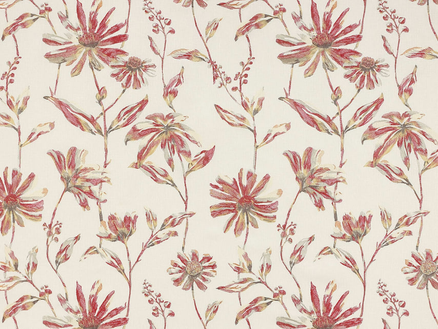 Die Farbinterpretation dieser gestickten, kletternden, offenen Blume verleiht diesem klassischen Motiv eine völlig neue und frische Note. Abstrakte Stickereien in Komplementärfarben unterstreichen die Einfachheit der natürlichen Formen.