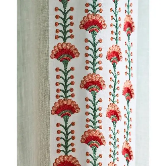Auf diesem großzügigen, farbig gewebten Leinenstreifen sind bezaubernde, in sauberen Reihen angeordnete Blumenmotive aufgestickt. Jede Blume ist mit erhabenen, gestickten Punkten und handgeschnittenen, getufteten Details verziert, die den Blick auf sich ziehen.