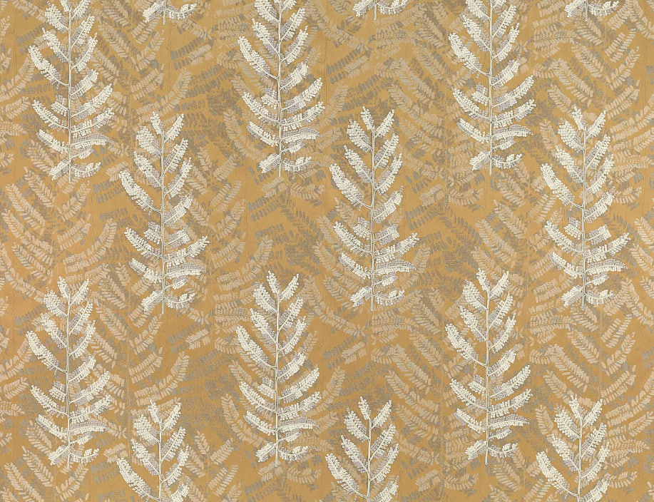 Dieser elegante Drapierstoff mit einem Muster aus Skelettblättern zeichnet sich durch eine beeindruckende Mischung von Techniken aus. Die abstrakten Blattwedelmuster werden auf einem Jacquard-Grundgewebe dargestellt. Das Hauptblatt wird mit groben Stickstichen hervorgehoben, wobei die Maserung durch eine erhabene Kordelführung hervorgehoben wird. Das Ergebnis ist ein üppig strukturiertes Design.