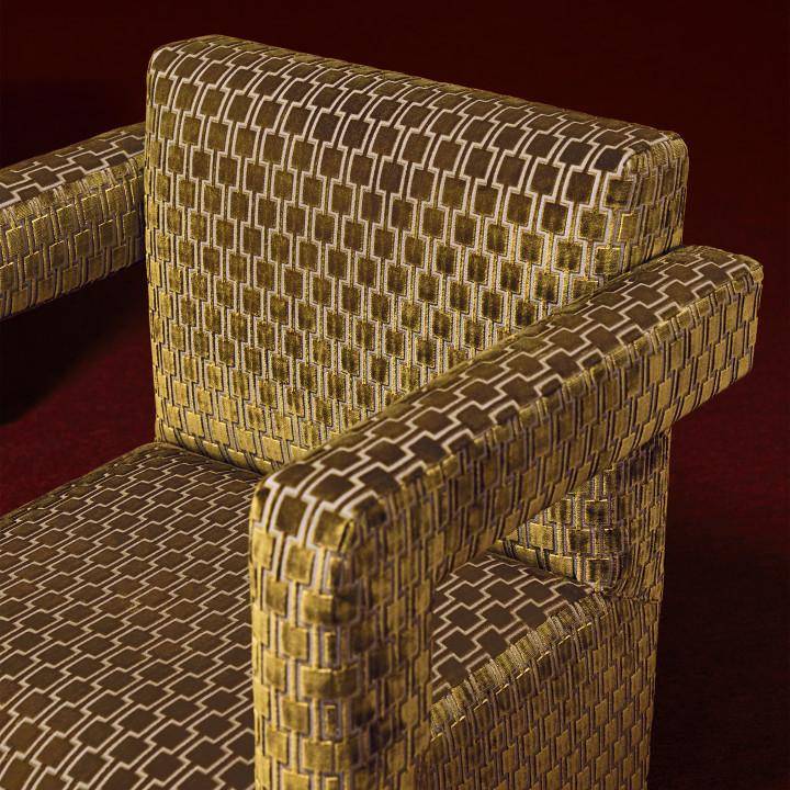 Kirkby Design ließ sich vom legendären geometrischen Mokka inspirieren, der in den 1960er Jahren bei der Rekonstruktion der Londoner U-Bahn und Züge häufig verwendet wurde. Dieses Muster spiegelt die Atmosphäre der Epoche wider – lebhaft, dynamisch und unvergesslich. Zugleich wurde das Design neu interpretiert und in Form eines Samtstoffes mit dreidimensionalem geometrischem Gewebe umgesetzt, was ihm eine besondere Tiefe und haptisches Vergnügen verleiht. Dieser Ansatz verbindet Retro-Ästhetik mit den modernen Anforderungen an Innendesign.