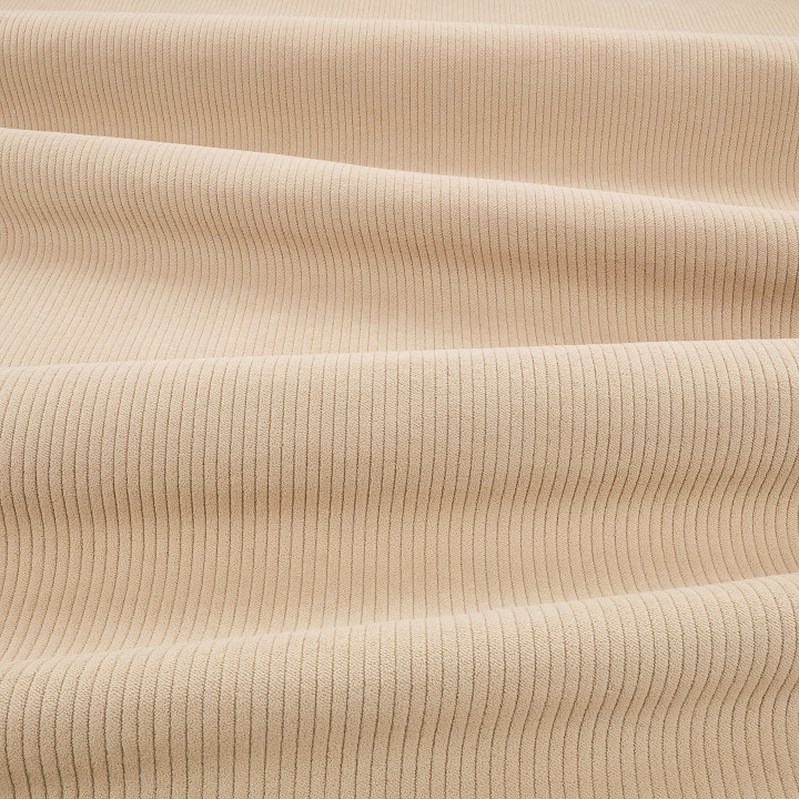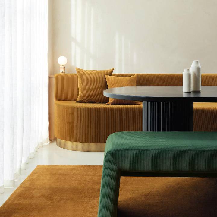 Seine charakteristischen, weichen Rippstrukturen erzeugen Schatten- und Lichteffekte, die der Oberfläche Tiefe und taktile Wärme verleihen. Dieser Stoff ist äußerst langlebig — bis zu 70.000 Martindale-Zyklen — und somit eine vielseitige Wahl für stark beanspruchte Innenräume und Möbel.